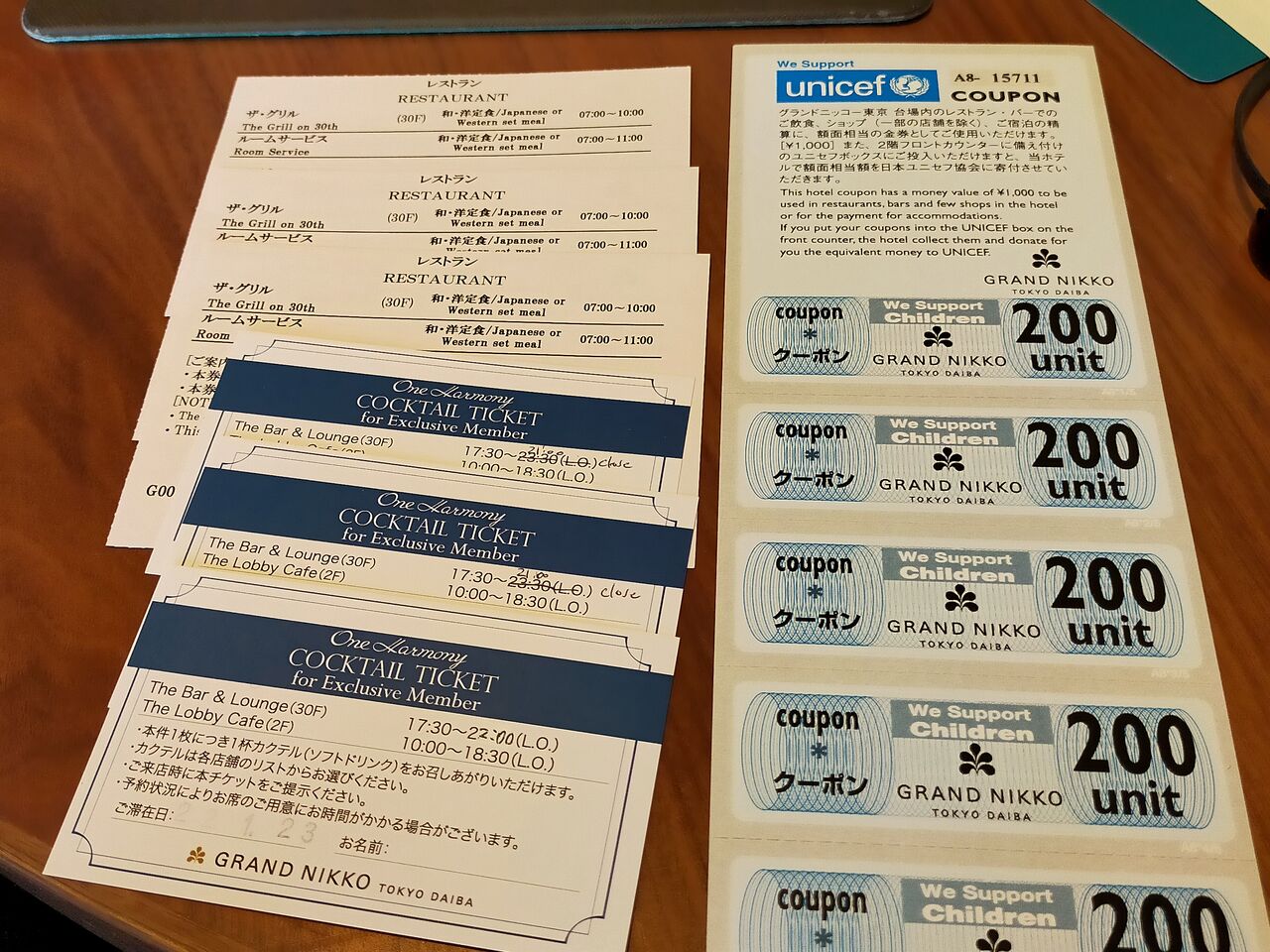 今回のプランは「【定額36,000円】広々42㎡デラックスルーム 25階以上エグゼクティブフロア!会員様はさらに5%OFF/ご朝食付」なので、チェックインの際に朝食券とワンハーモニーエクスクルーシブ会員特典でラウンジのワンドリンク券と1000円分のクーポンも頂きました。