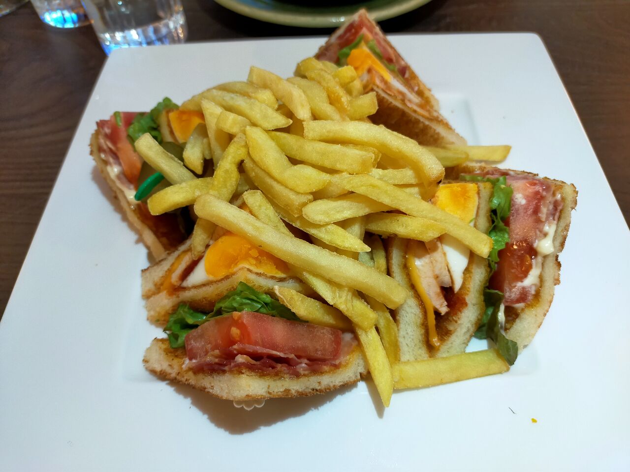 フライドポテトが上にタップリ乗ったクラブハウスサンドイッチ
