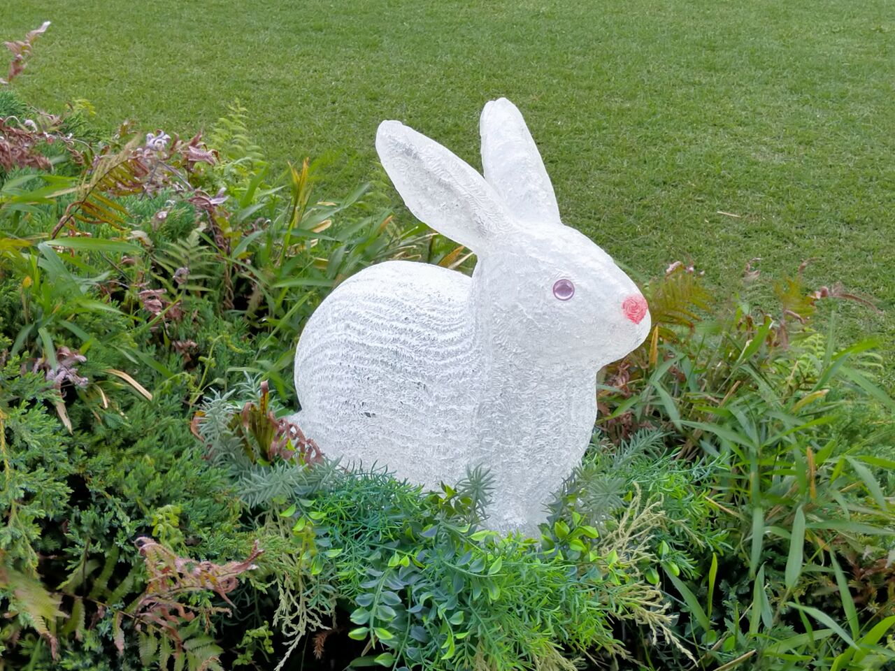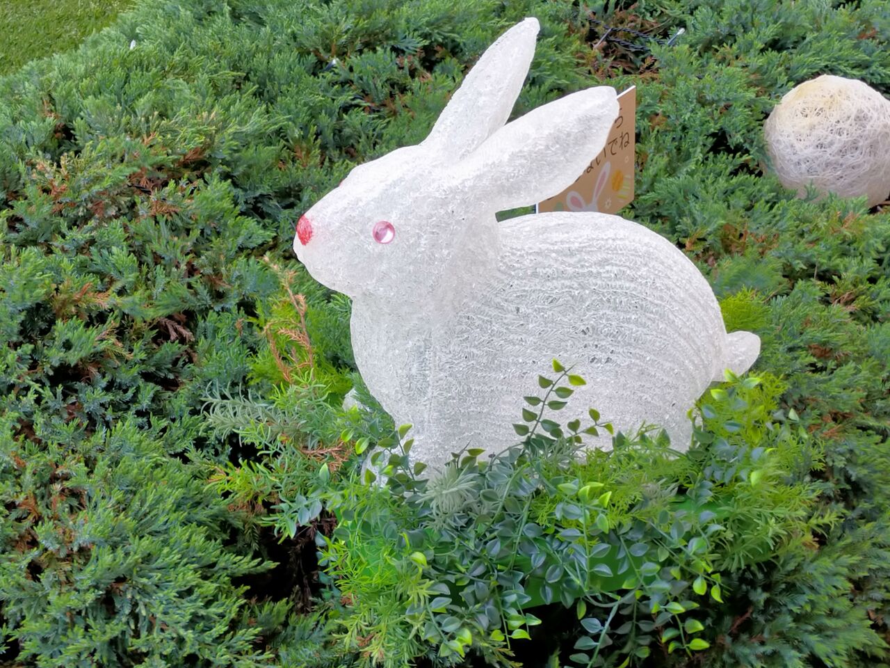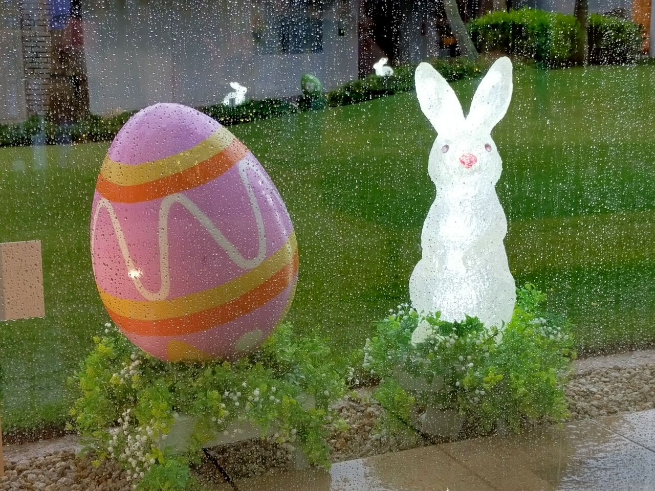 チェックイン日は雨だったので、ガラス越しにお庭の卵とウサギのオブジェ