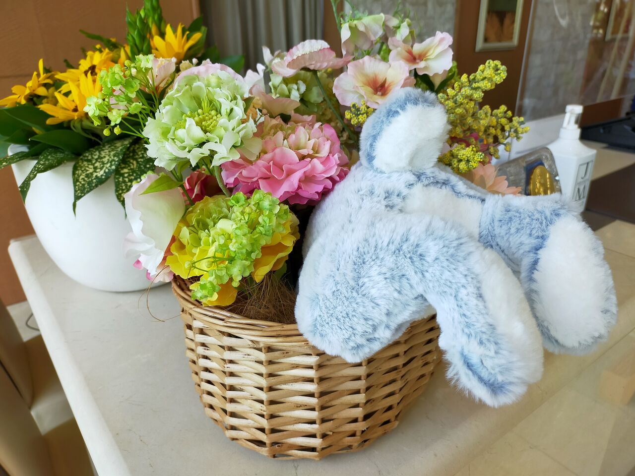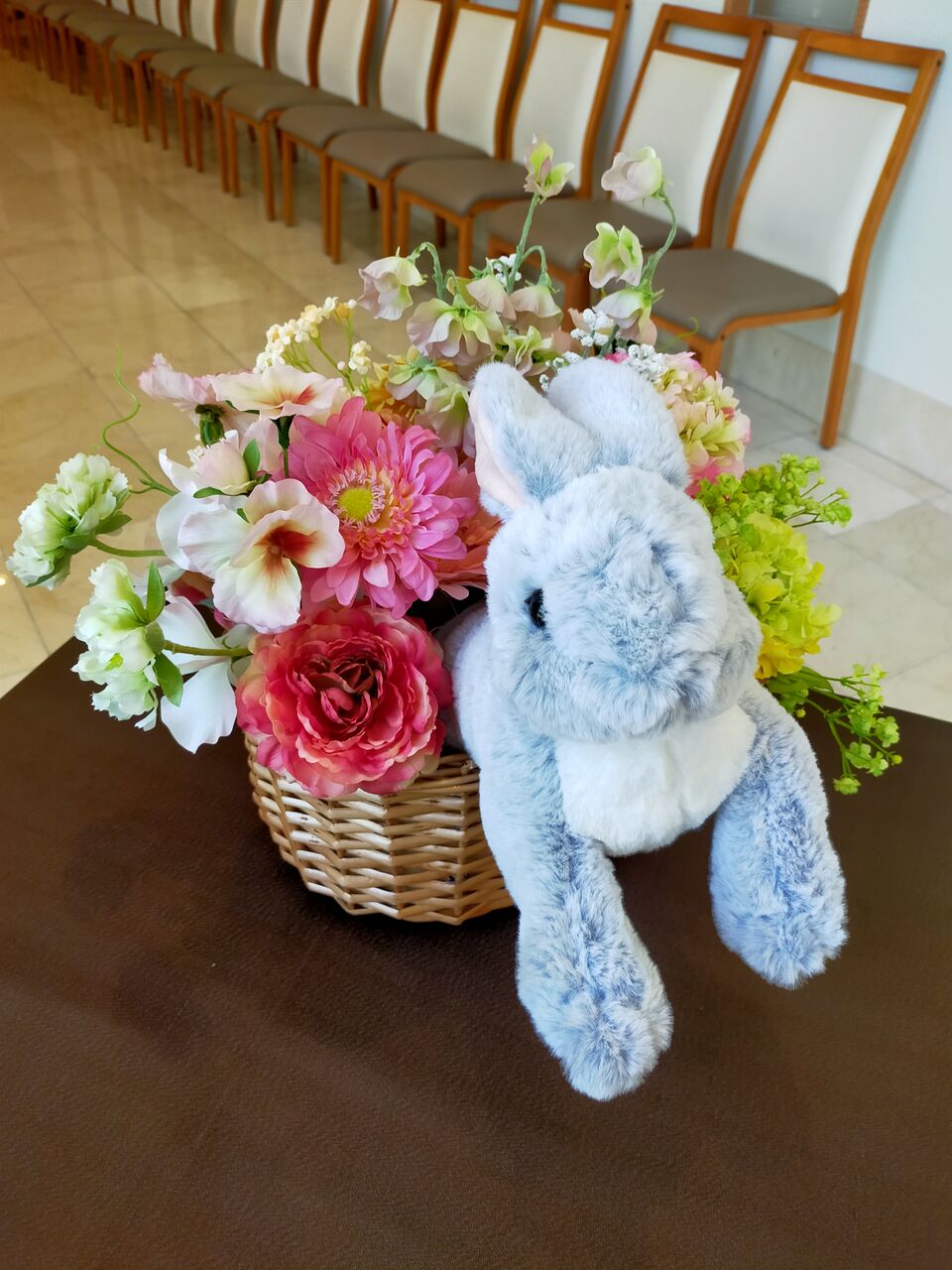 チェックインカウンターの横に花かごに頭から突っ込んだかわいいウサギを発見