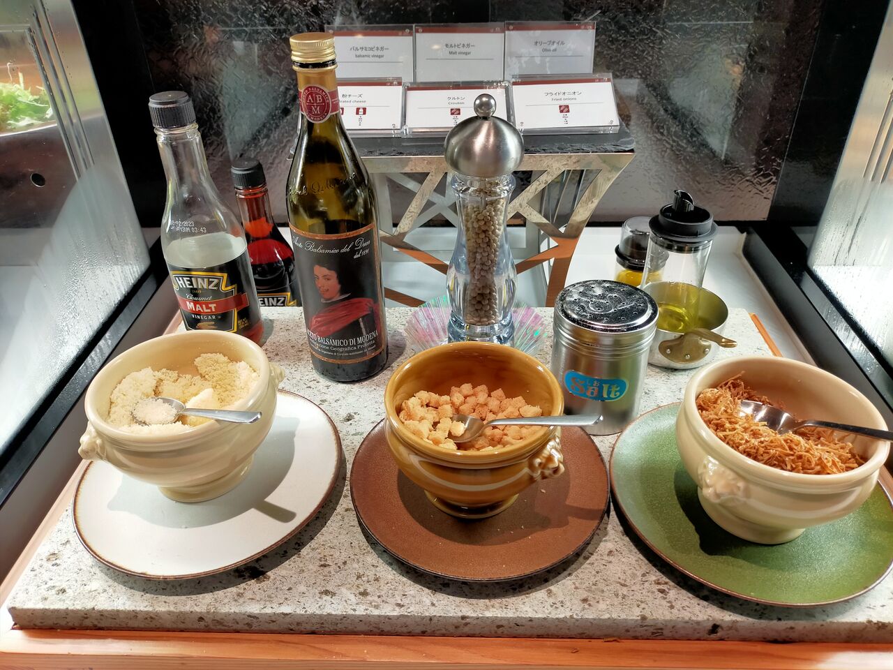 サラダコーナーが二つに分かれていて間にトッピングとオイル類。