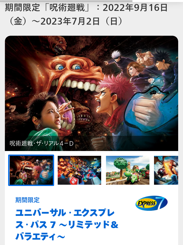 期間限定「呪術廻戦・ザ・リアル 4-D」とニンテンドーエリア・ハリーポッターエリアの人気アトラクションに他2つのアトラクションが優先になる 「ユニバーサルエクスプレスパス7 リミテッドバラエティー」