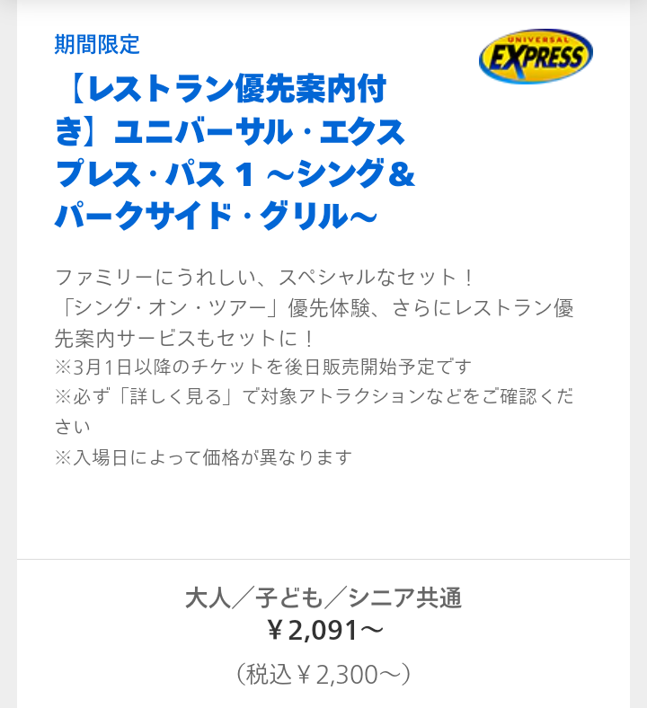 3月1日からの期間限定 レストラン優先案内付きシングオンツアー対象の「レストラン優先案内付きユニバーサルエクスプレスパス1」