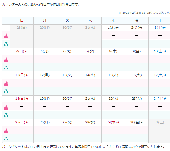3/20からパークチケットの料金変動制が導入されますが、チケット販売状況カレンダーにも値上げとなる日の対象日がしっかり明記されていますね。