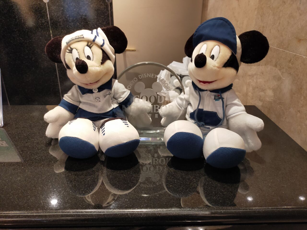 グッドネイバーホテルのミッキー&ミニーのぬいぐるみがフロント隅っこにひっそりと置かれています。