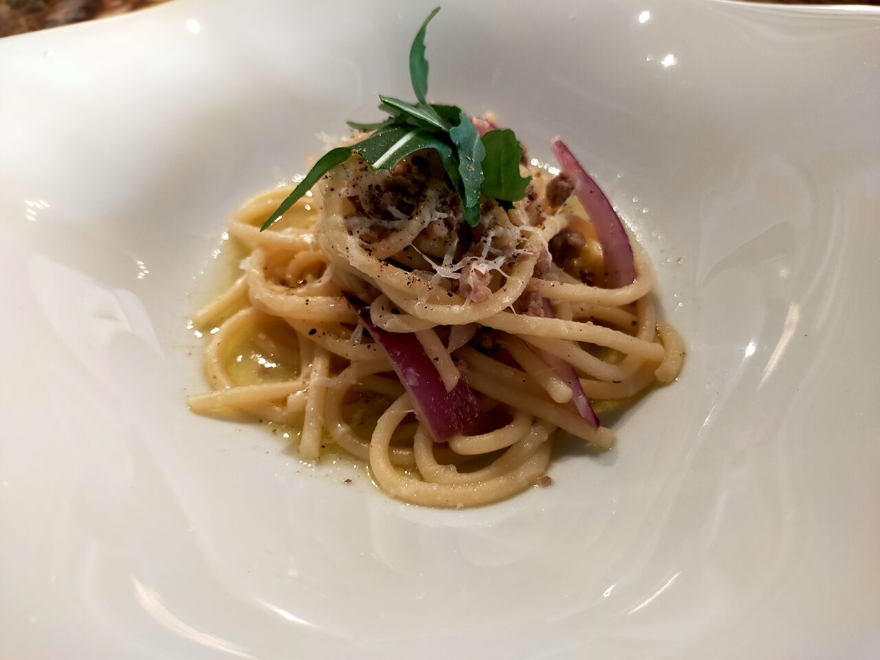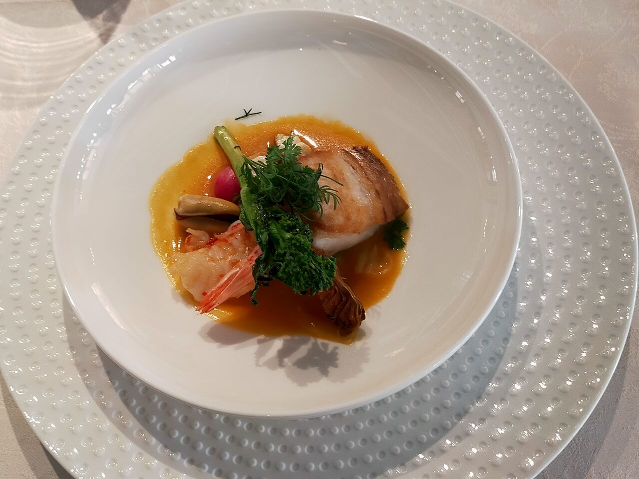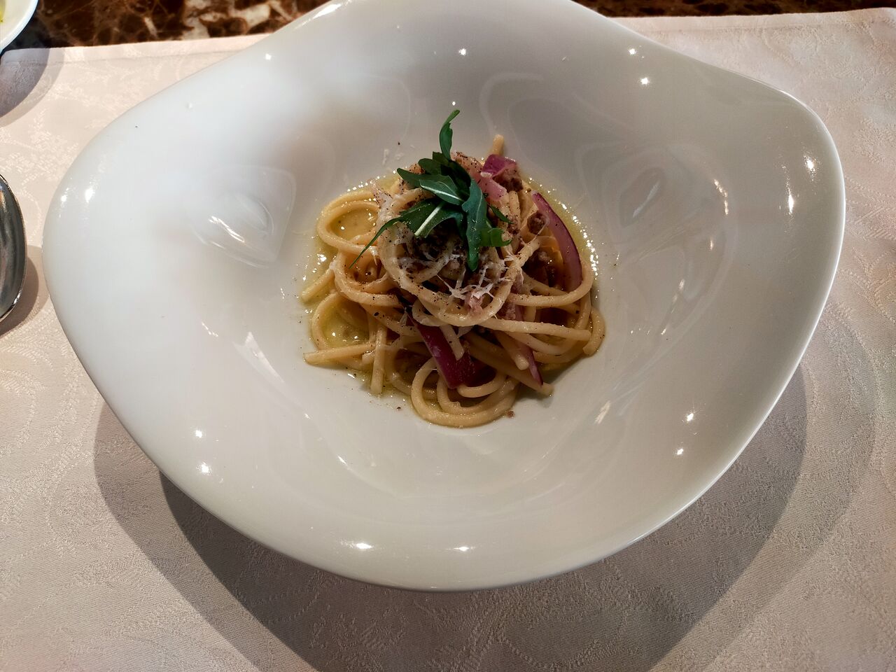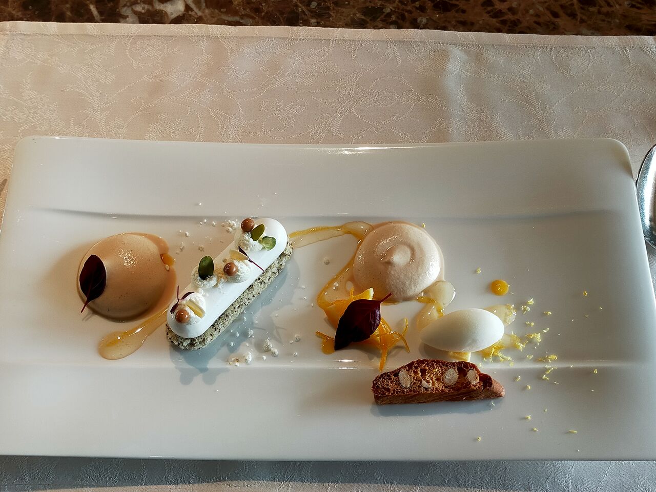■サーモンのカンパリマリネと帆立貝 洋梨のモスタルダ カラスミ■スパゲットーニ フラタッキオーネ サルシッチャ ペコリーノ■本日の魚のインパデッラ 海老とムール貝 サフラン香るブロテッドまたは牛フィレ肉のタリアータ クレソンとトレヴィーゾ 牛肉と白インゲン豆の煮込み■アーモンドの軽いムースとカントゥッチーニ レモン風味の蜂蜜ジェラート■コーヒー または 紅茶