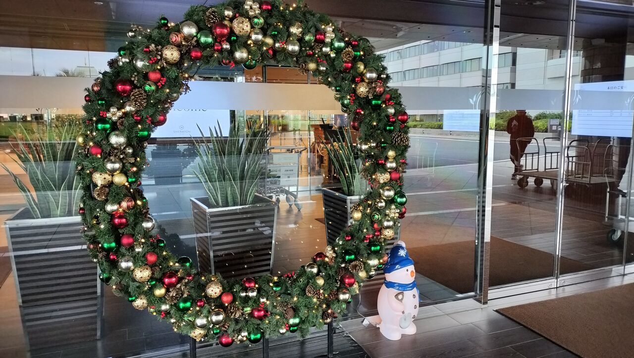 入り口には大きなリースと、右端にちょこんと雪だるま