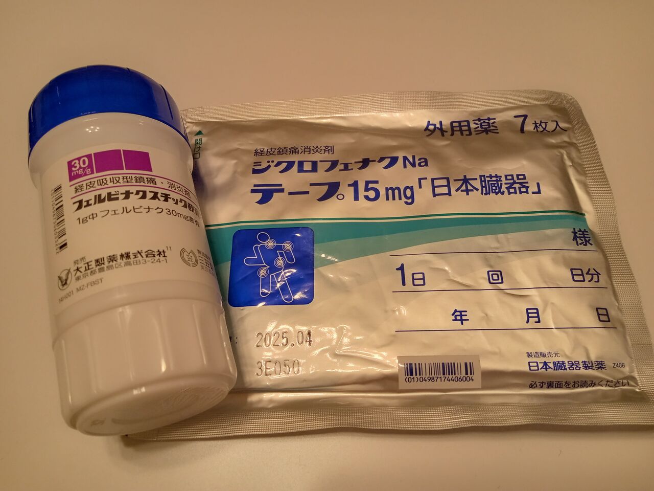 経皮鎮痛消炎剤のシップと、太いスティックのりみたいな形状の塗り薬。