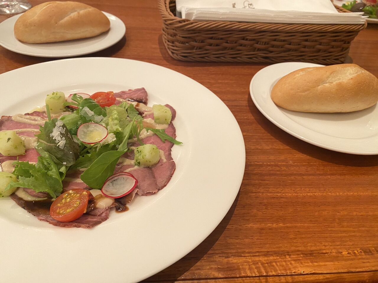 前菜1種類目 ローストビーフのサラダ、トンナータソースとパン