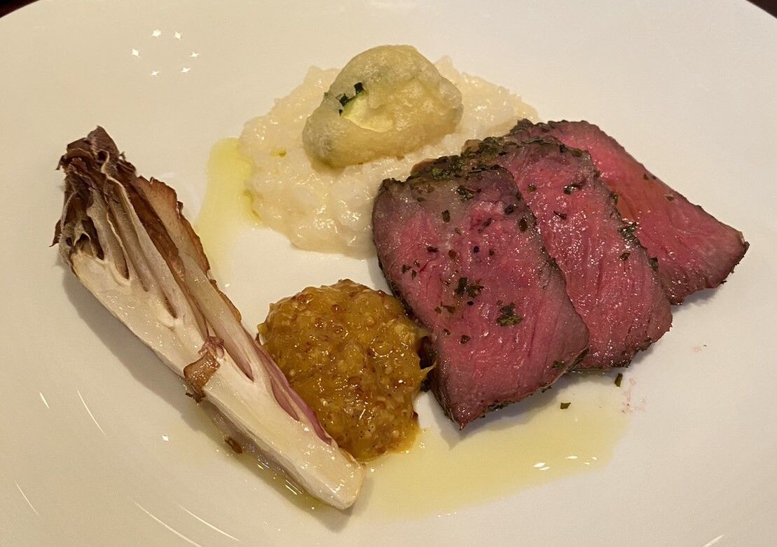 ・牛肉のタリアータ オレンジのモスタルダ、 ズッキーニのフリットとレモンのリゾット添え