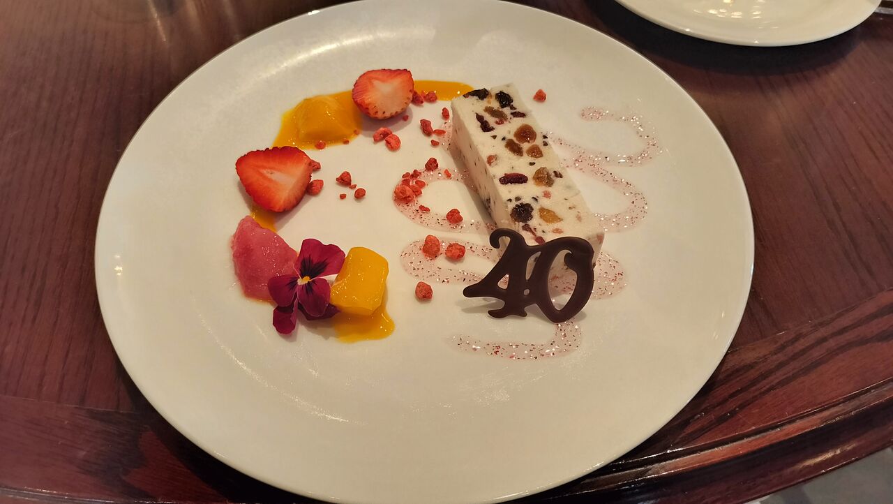 40周年のスペシャルセット ¥5,500・鮪と帆立貝のプレコット、赤パプリカムース添え・タリオリーニ パンチェッタと蕪のサフランソース、プロシュートとチーズのチップ添えほかのパスタ料理に変えることができます。・牛肉のタリアータ オレンジのモスタルダ、ズッキーニのフリットとレモンのリゾット添え・リコッタとドライフルーツのムースケーキ