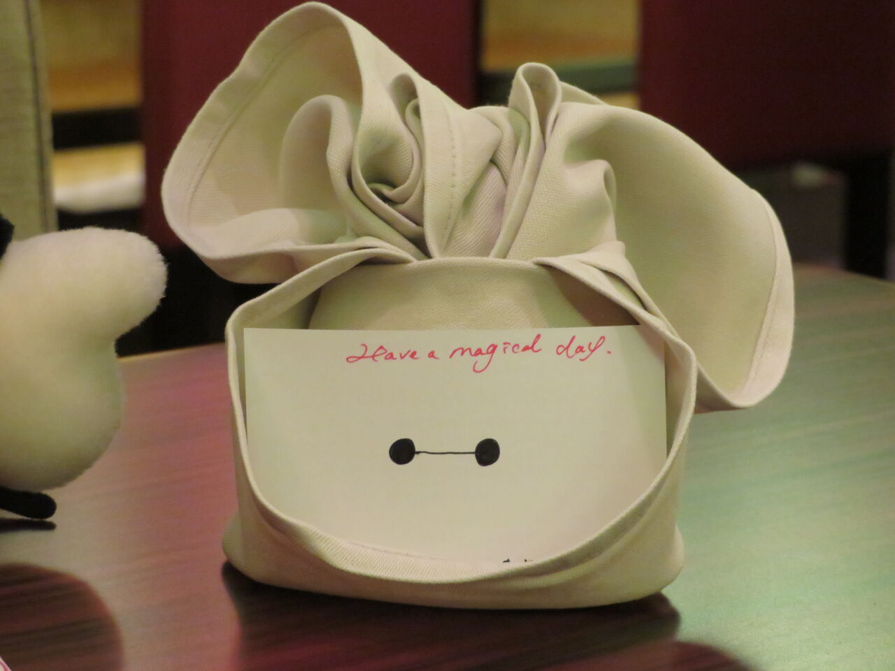 「ミッキー一人じゃさみしいと思って、ミニーちゃん作ってみました」とナプキンで作ったミニーを持ってきてくれました(*^^*)
