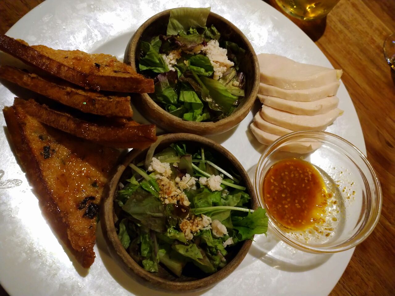 前菜として、サラダ、タイ海老トースト。四川風よだれ鶏がつきます。