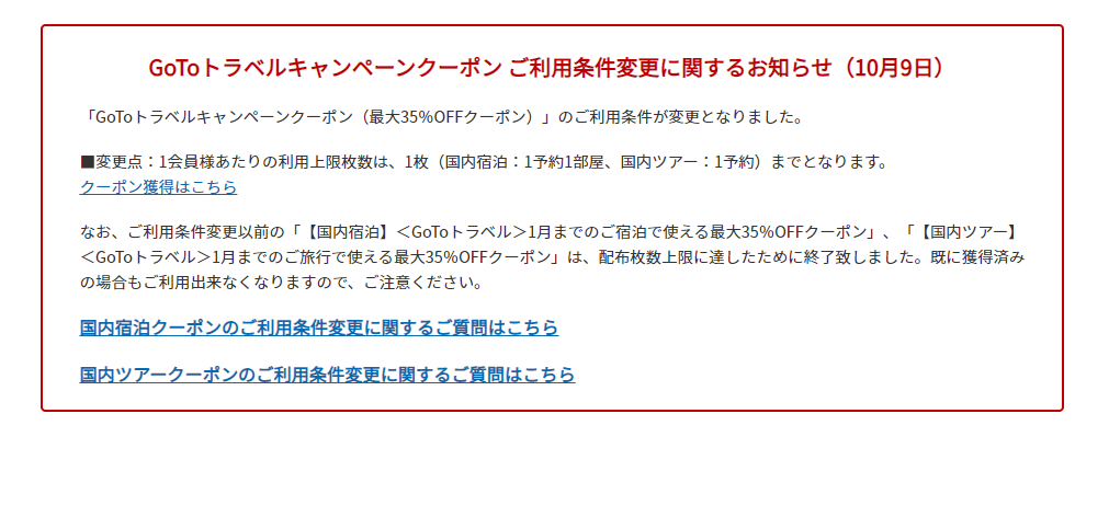楽天トラベルGoToトラベルキャンペーンクーポン ご利用条件変更に関するお知らせ(10月13日)