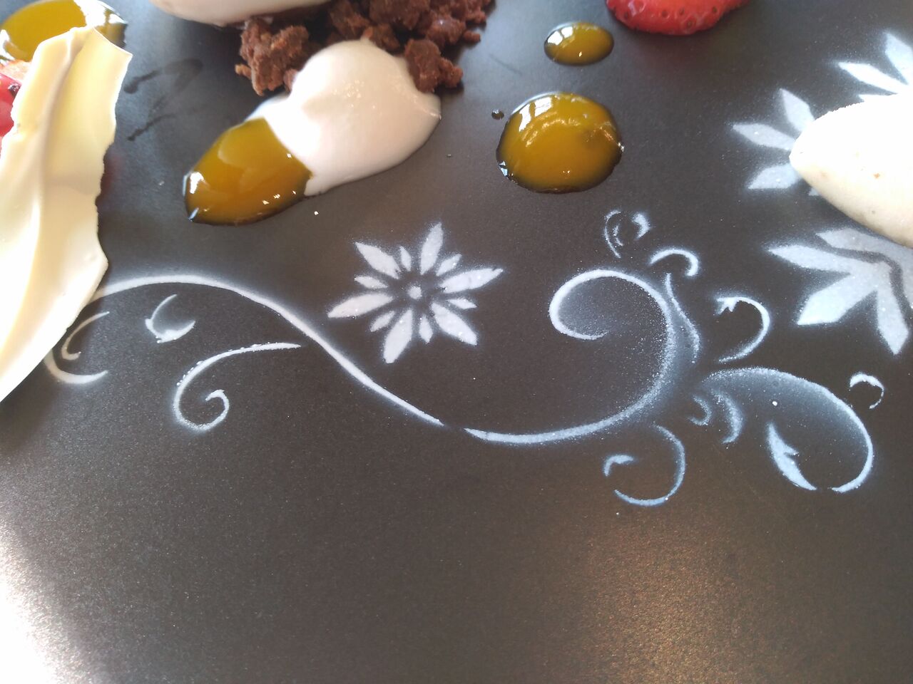 クリスマスらしい、素敵な模様が描かれた黒いお皿に白いデザートが映えます。