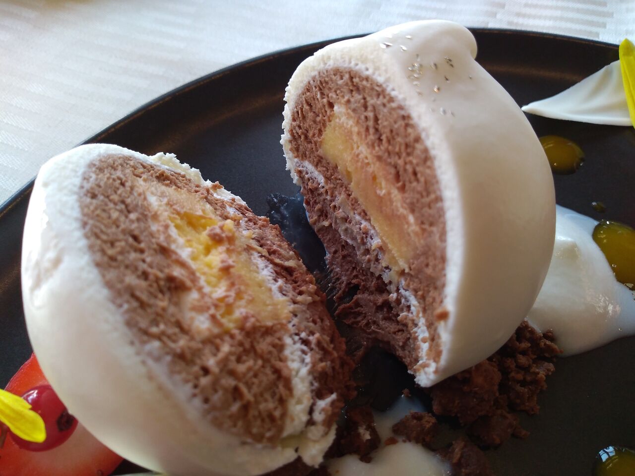 ■パッションフルーツクリーム入りチョコレートムース 洋梨のソルベ