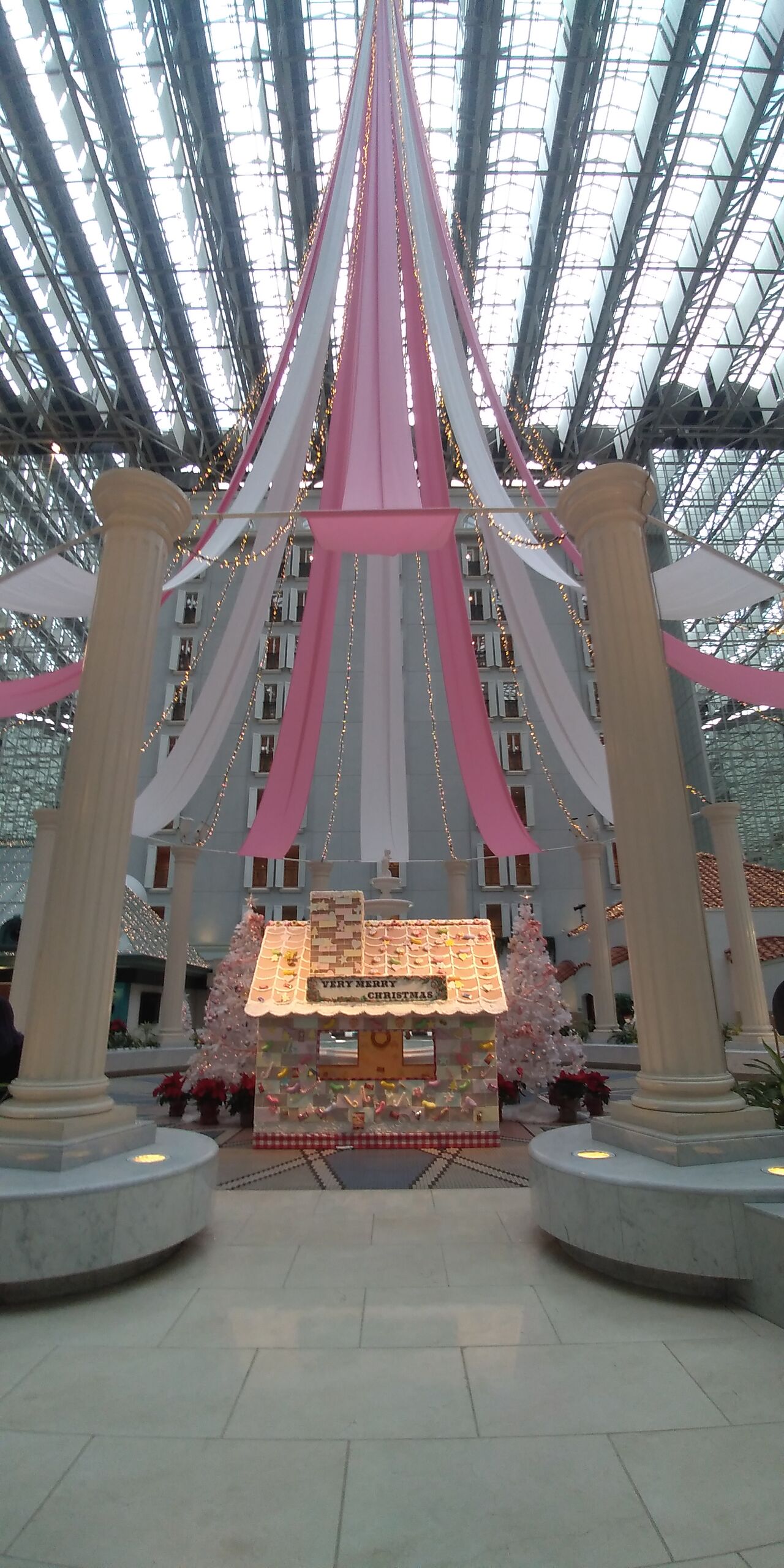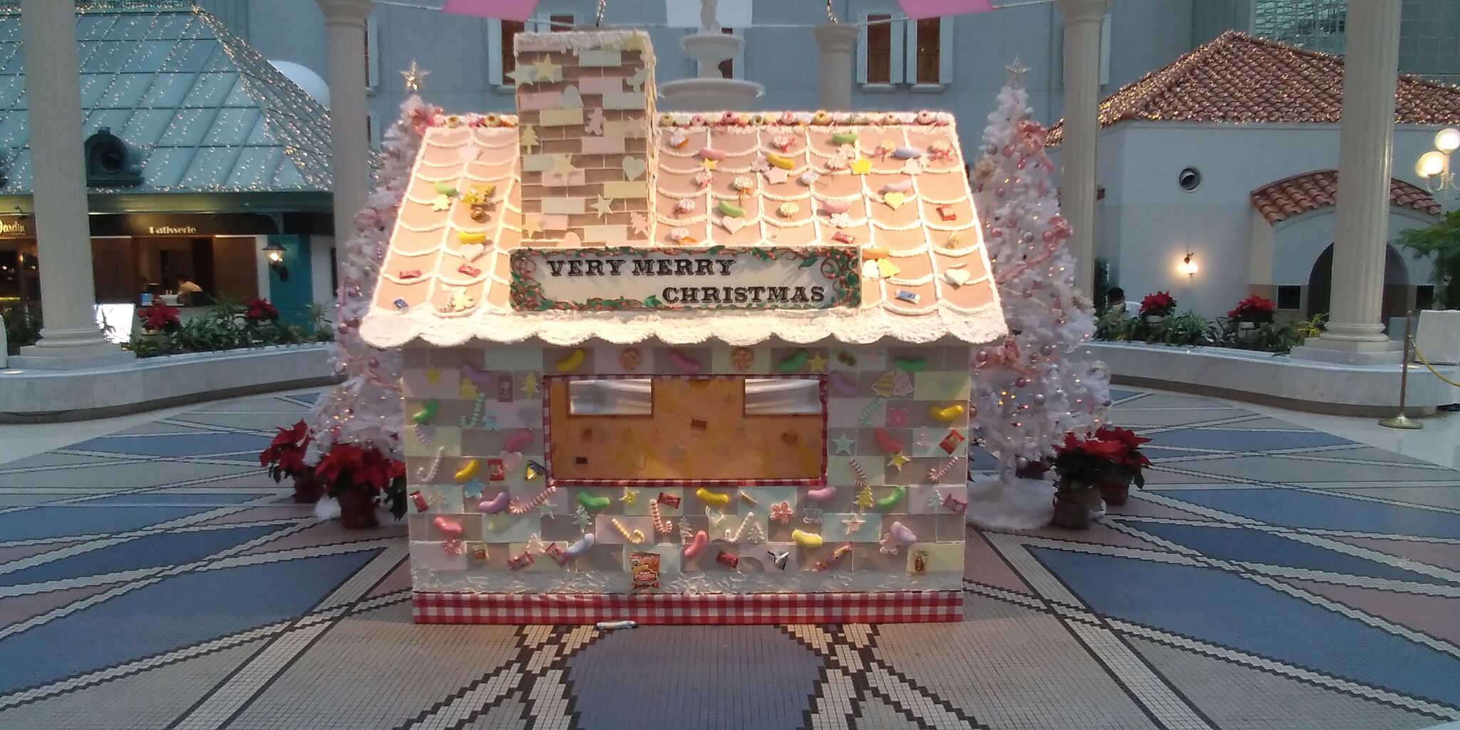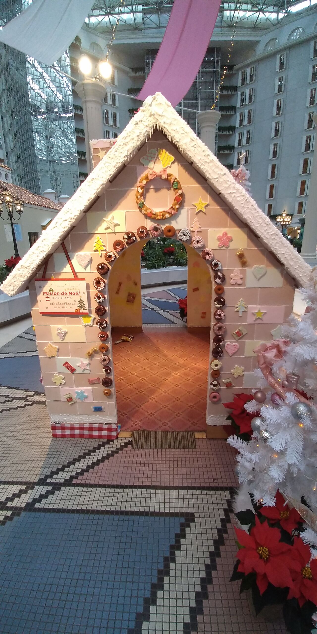 ホテルのクリスマスデコレーションもバージョンアップして、お菓子の家が登場していました。
