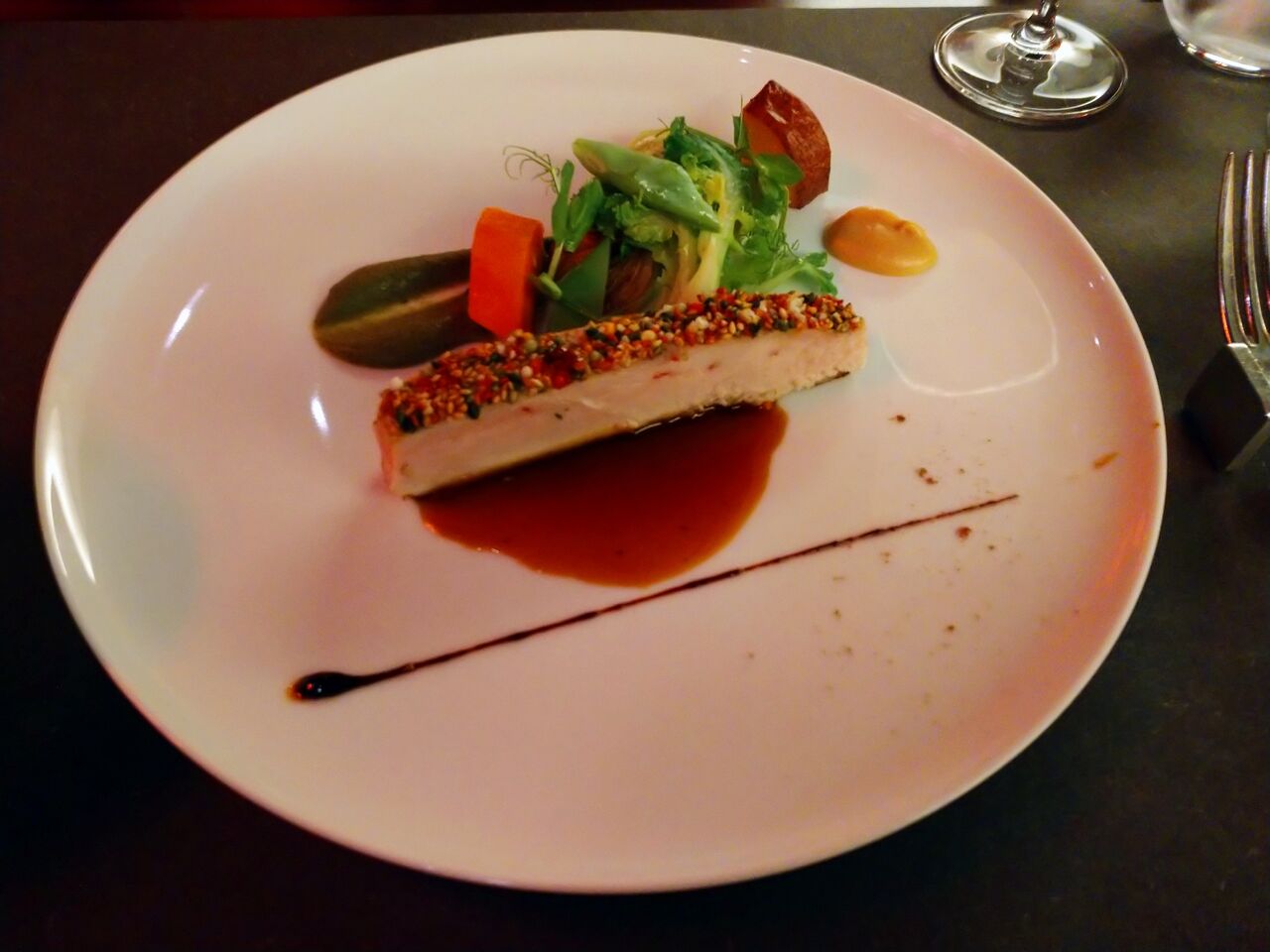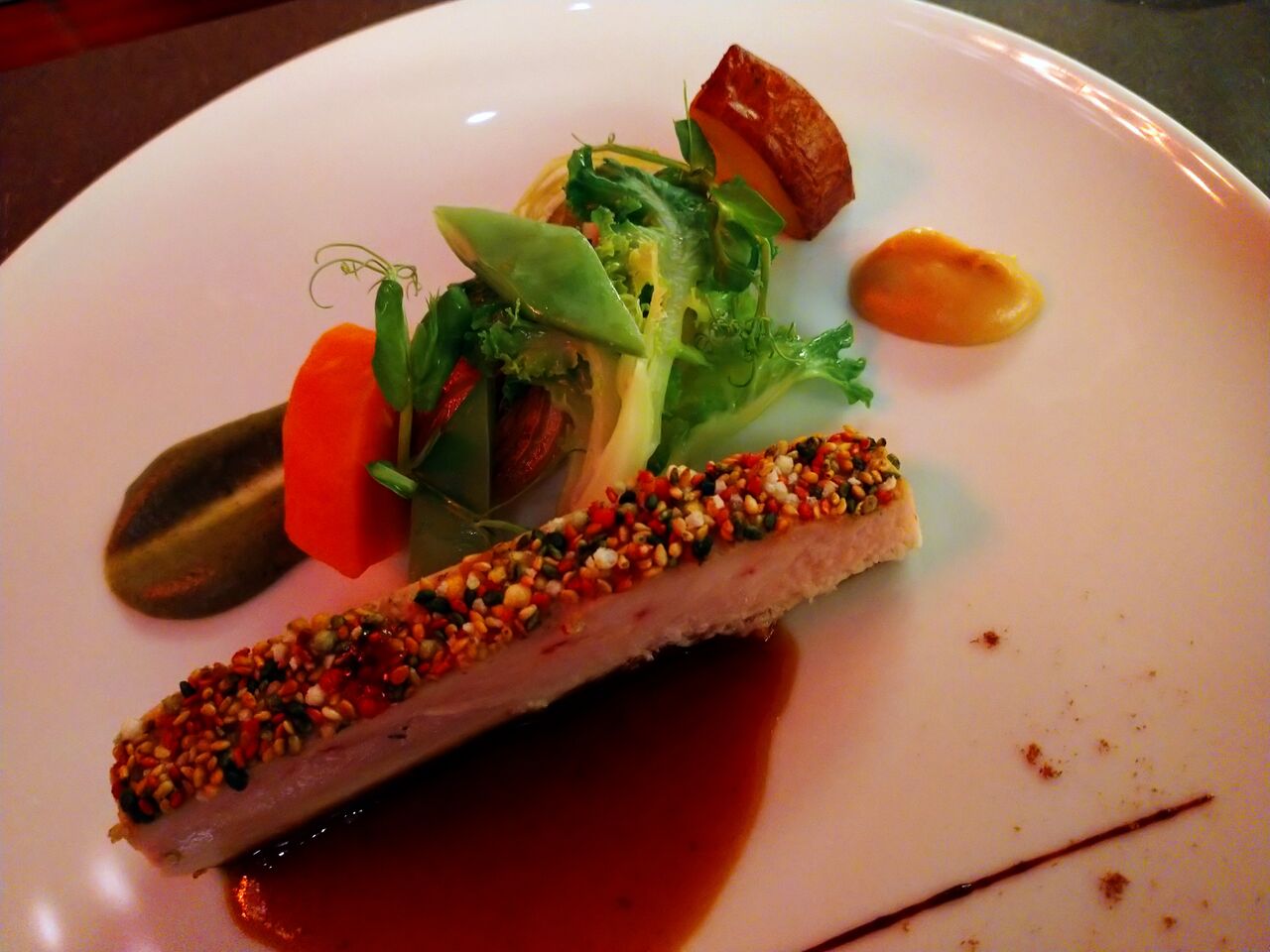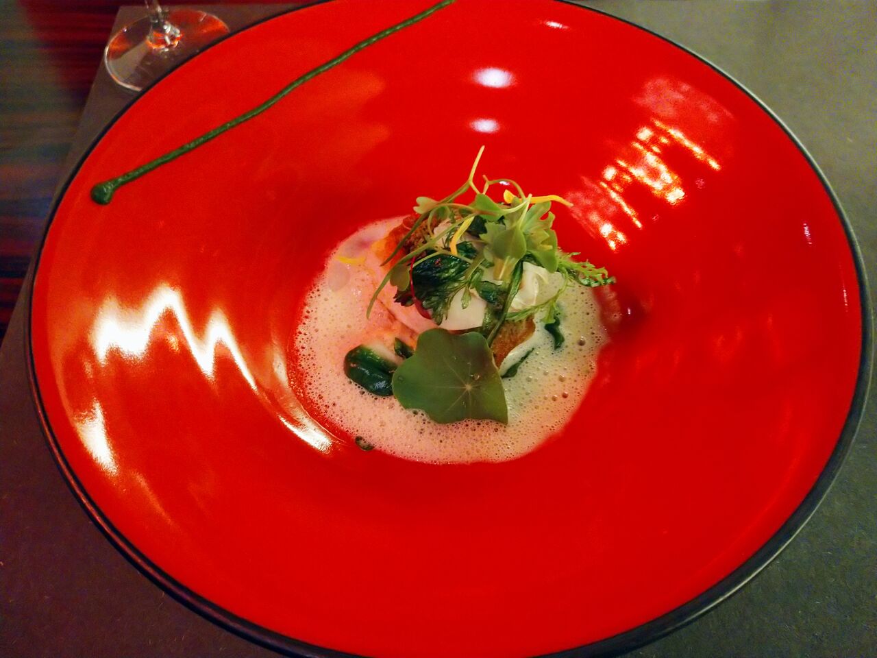 お皿左上の緑は柚子胡椒とほうれん草のソース。