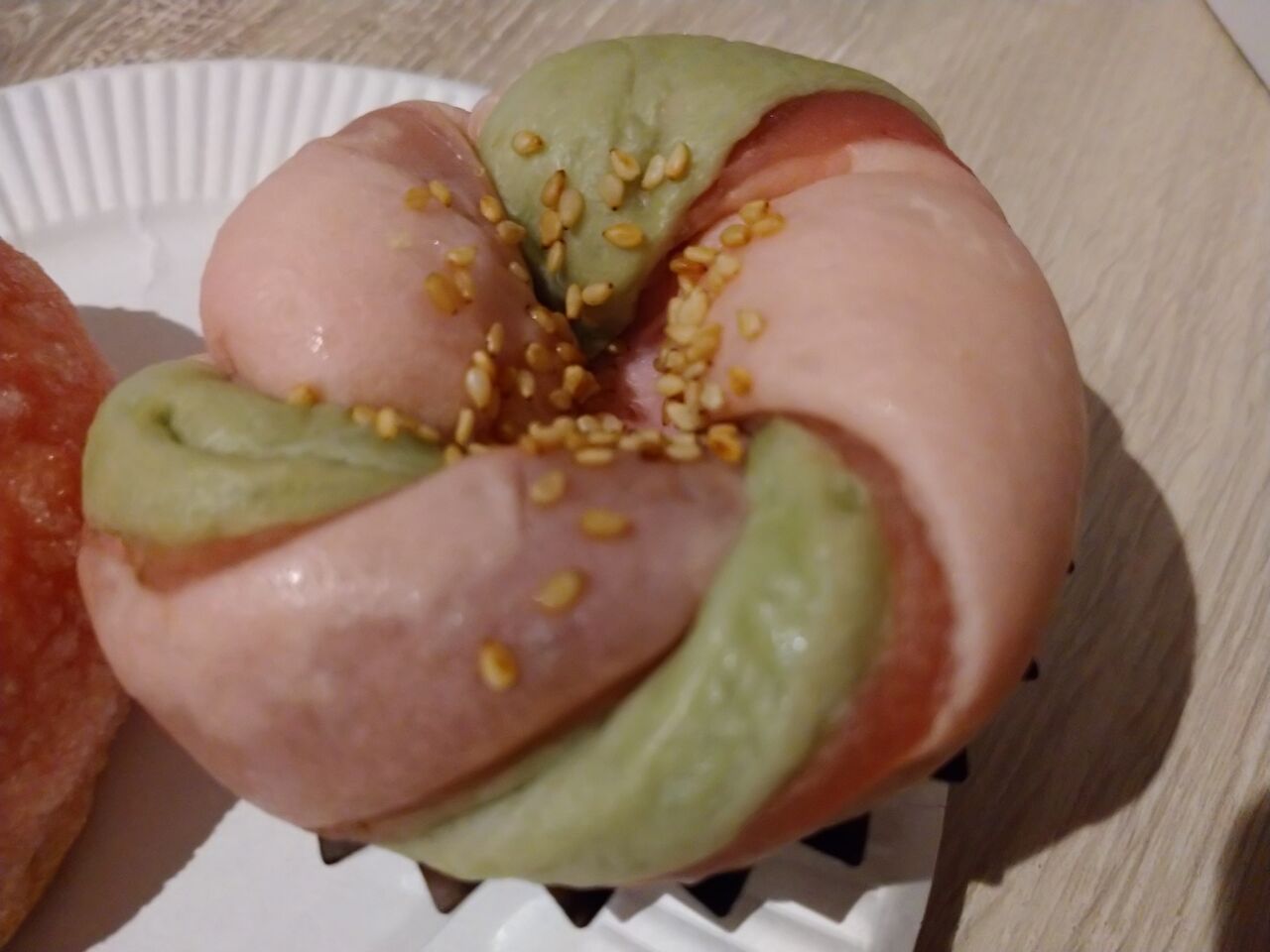 ビートで色付けした桜色とよもぎの緑色の生地に桜餡を入れて包み上げたもちもち食感のパン。春を感じられる一品です。