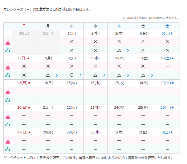 TDR新規日程チケットは6/11分まで販売済ですが、4/30の夕方に見た時点ですでに土日のチケットは完売。