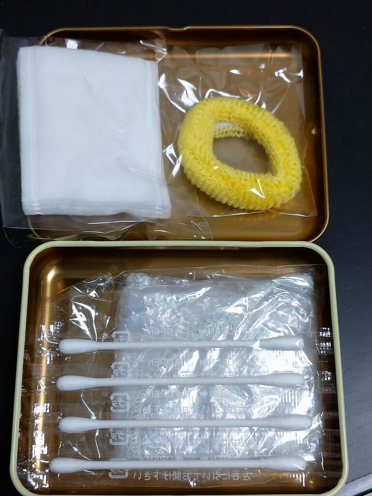 中身は普通(笑) コットン、ヘアゴム、綿棒、シャワーキャップ。