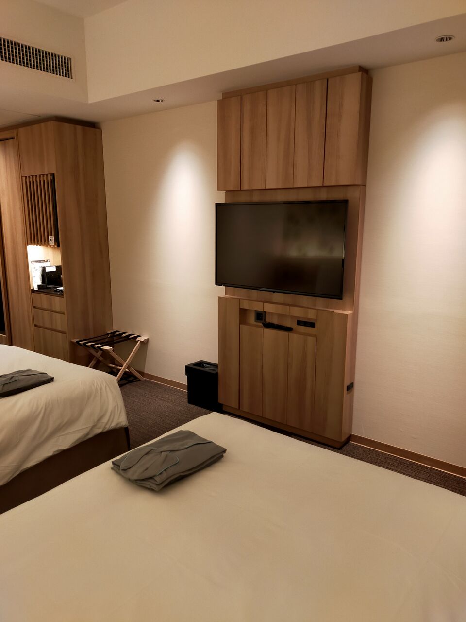 テレビは壁掛けタイプ。お部屋の備品はコンパクトにまとまっています。