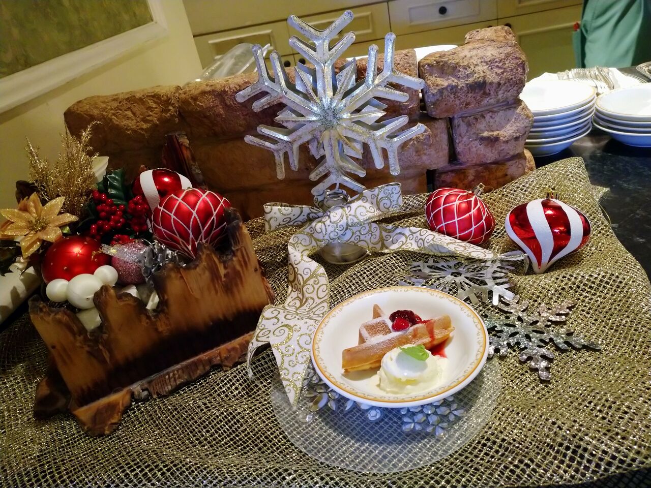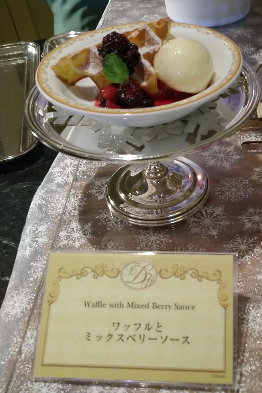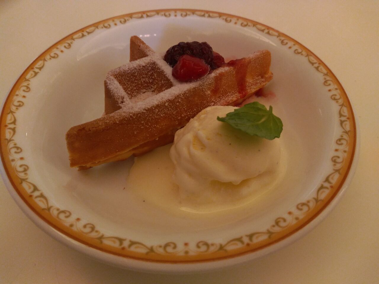 スペシャルデザートはワッフルとミックスベリーソース アイスクリーム添え。