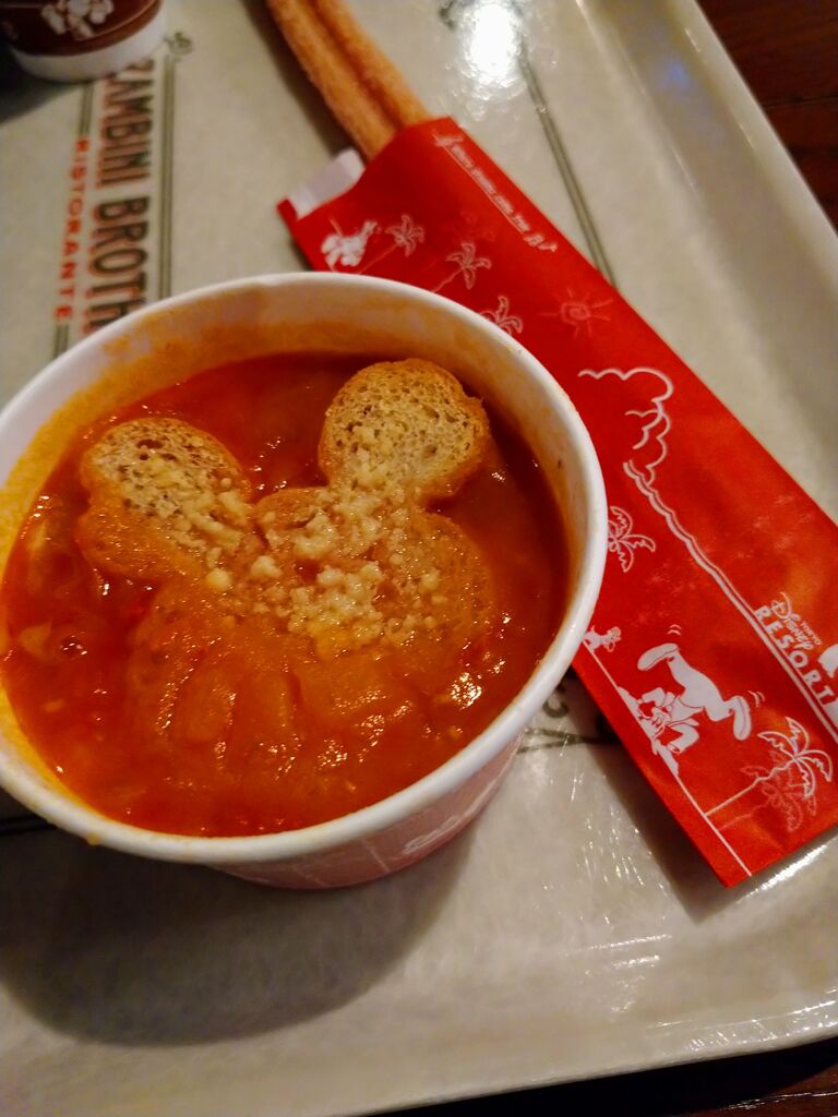ミネストローネはミッキーフェイスの大きなクルトン(パン?)も入っているし、中の具材も多いので食べ応えありですね。