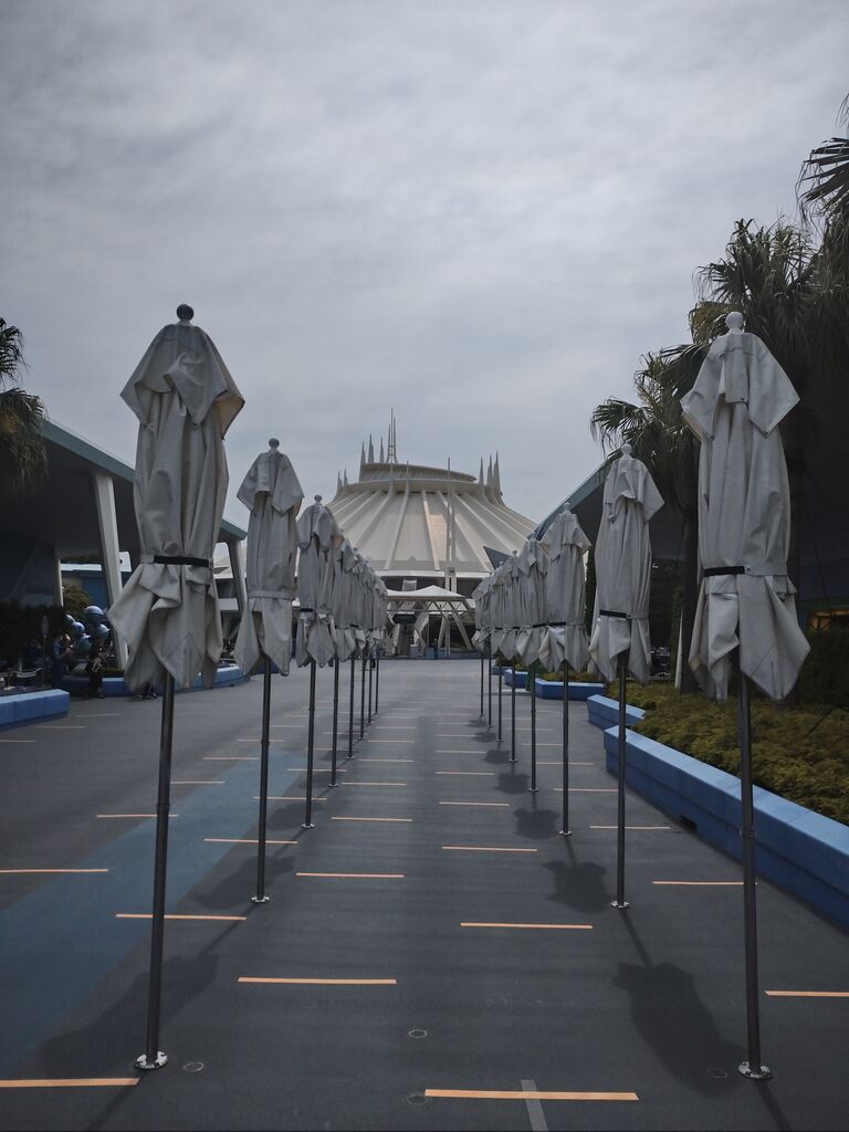 日除けのパラソルの列のまっすぐ先にあるのは、スペースマウンテンですが・・・