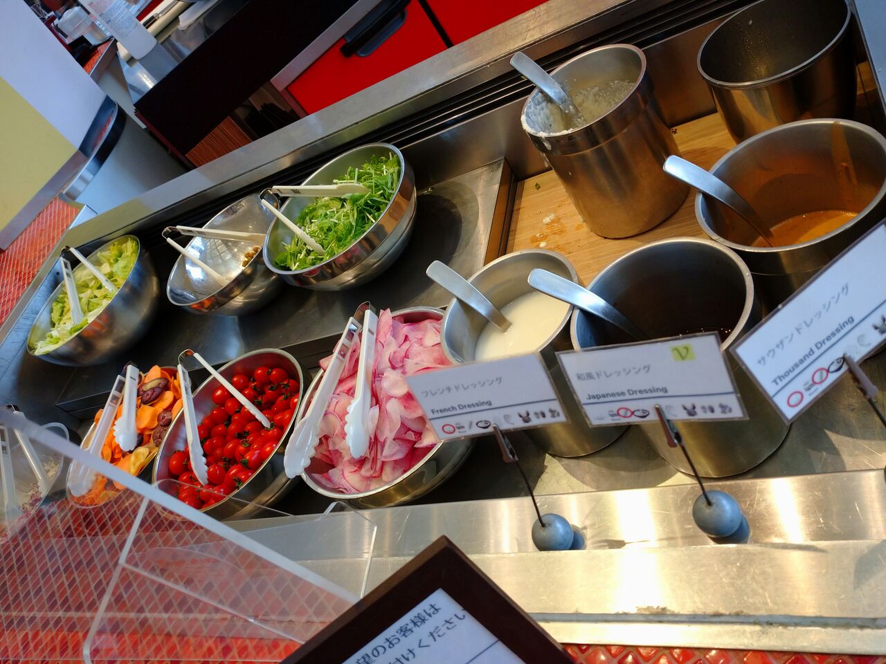 シーザーサラダはライブキッチンで、チーズの器内で混ぜ合わせてくれるタイプ。