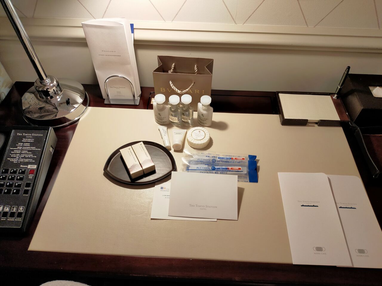 スプレー式の消毒液もアメニティの一つで、ホテルロゴ入りのマスクケースもありました。