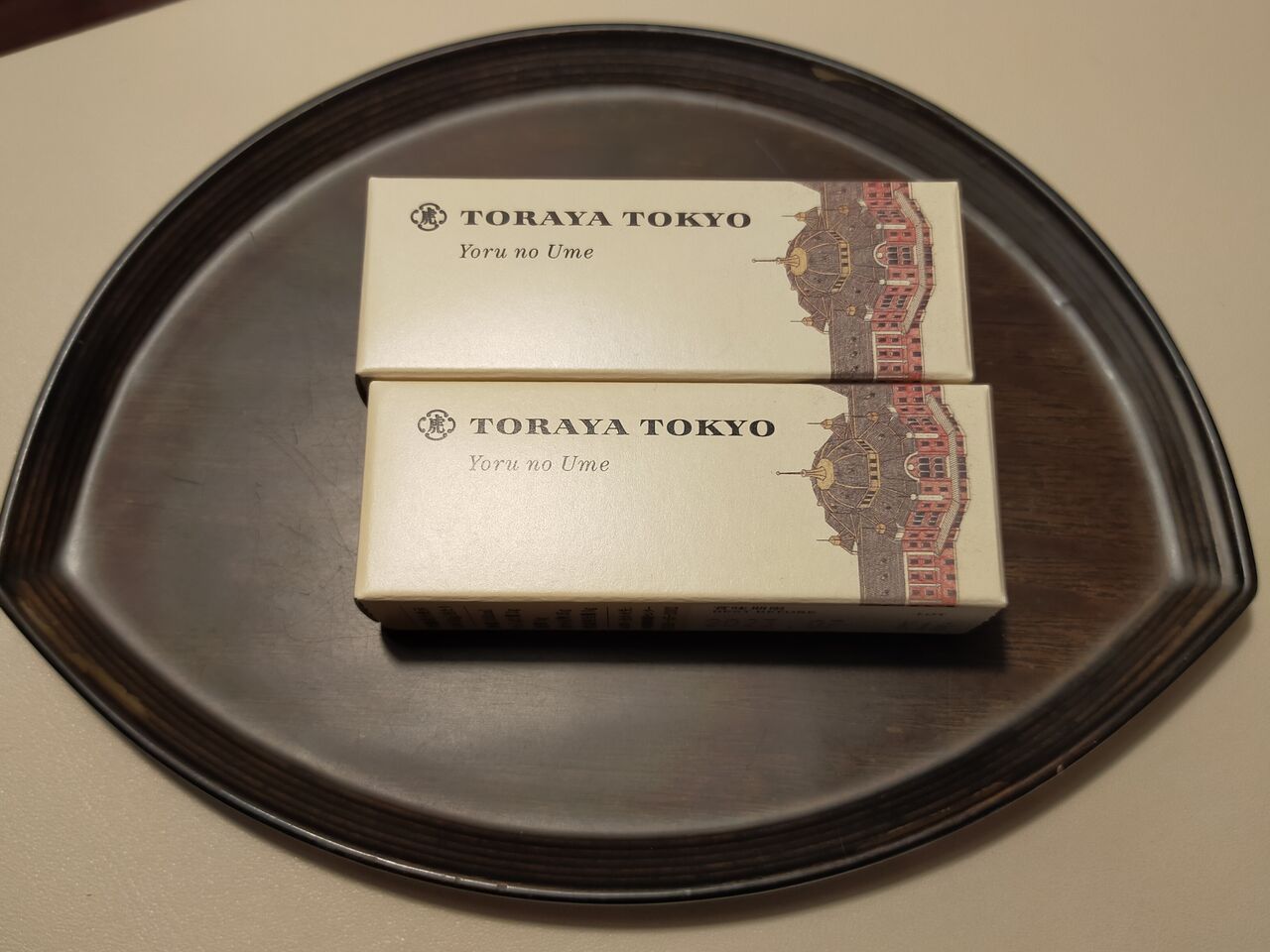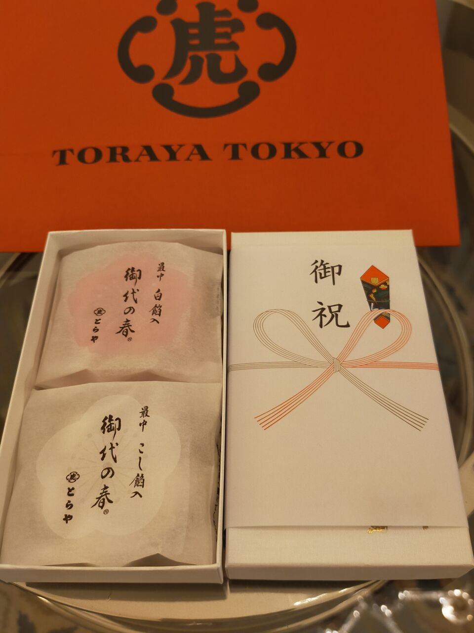 TORAYA TOKYO の赤いショップバッグが添えられた状態でおかれていたこちらは、記念日宿泊のお祝いで頂きました。