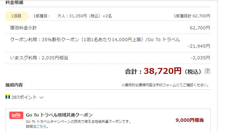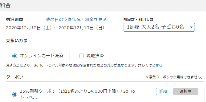 二食付きだったり、チケット購入権付(チケット代は別に必要)だったり様々なプランがあるので、見比べも大事。また、予約時点でキャンセル料100%のプランも結構あるので、キャンセルポリシーの確認は必須です。