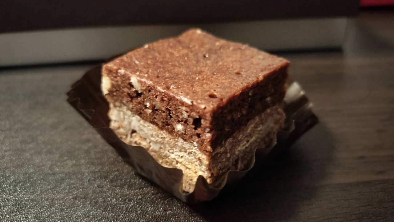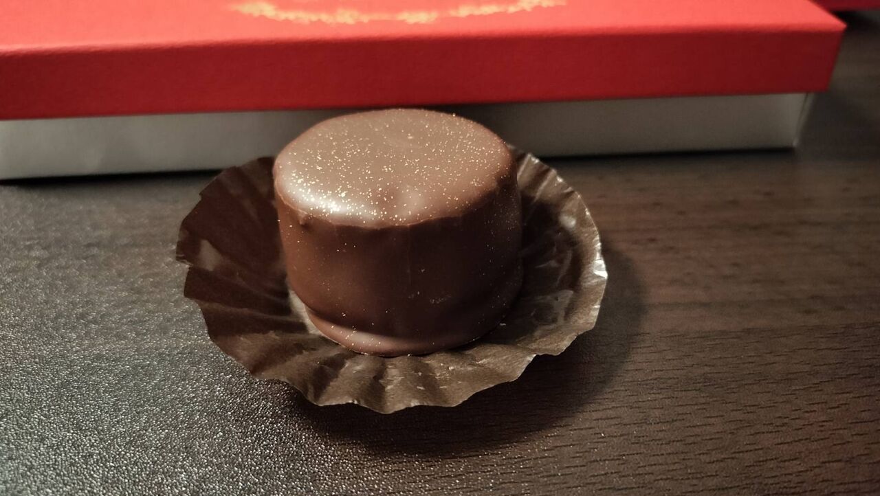 ココアパウダーをまとった薄いチョコの中に、トロトロのティラミスが入った一口チョコ