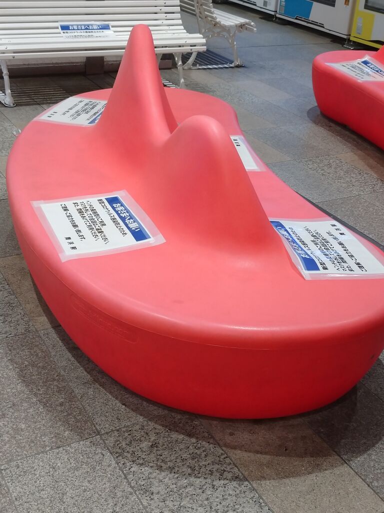駅構内のベンチは隣り合わせて座らないように張り紙がしてありました。