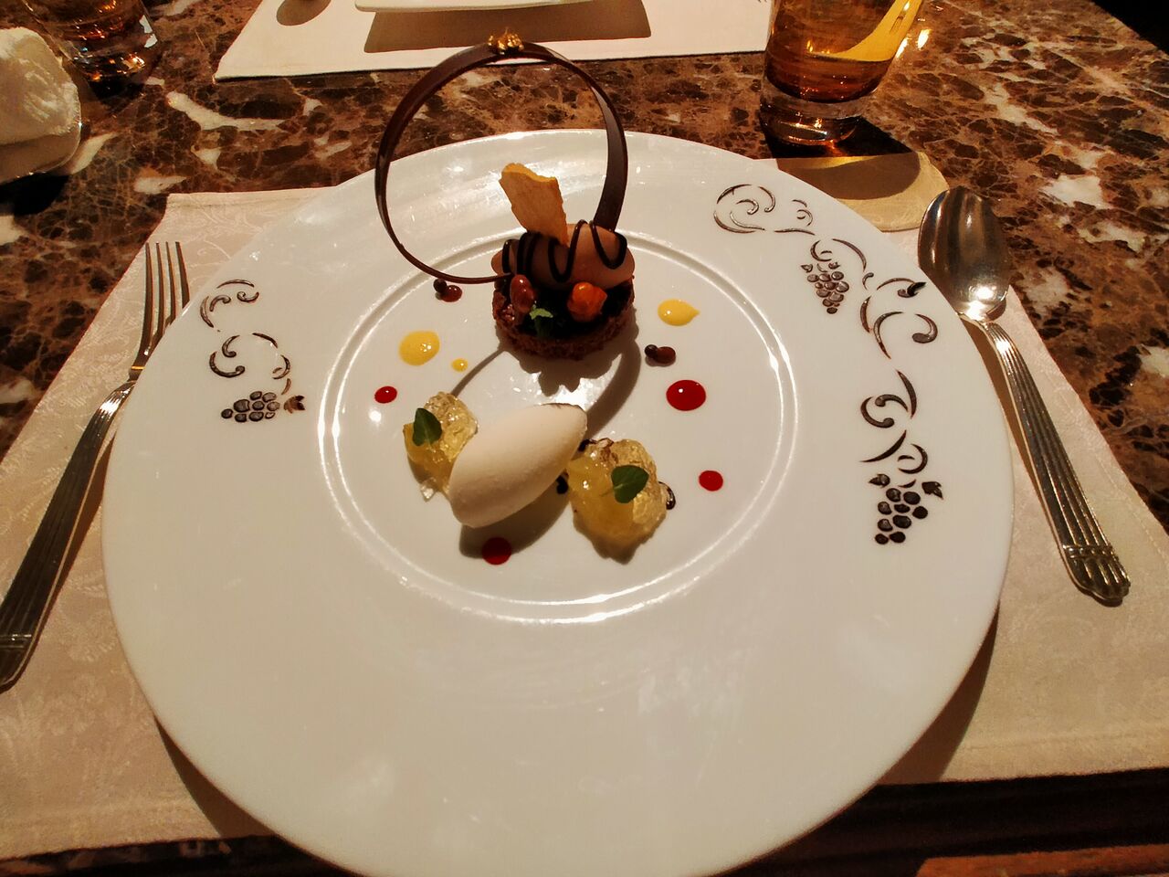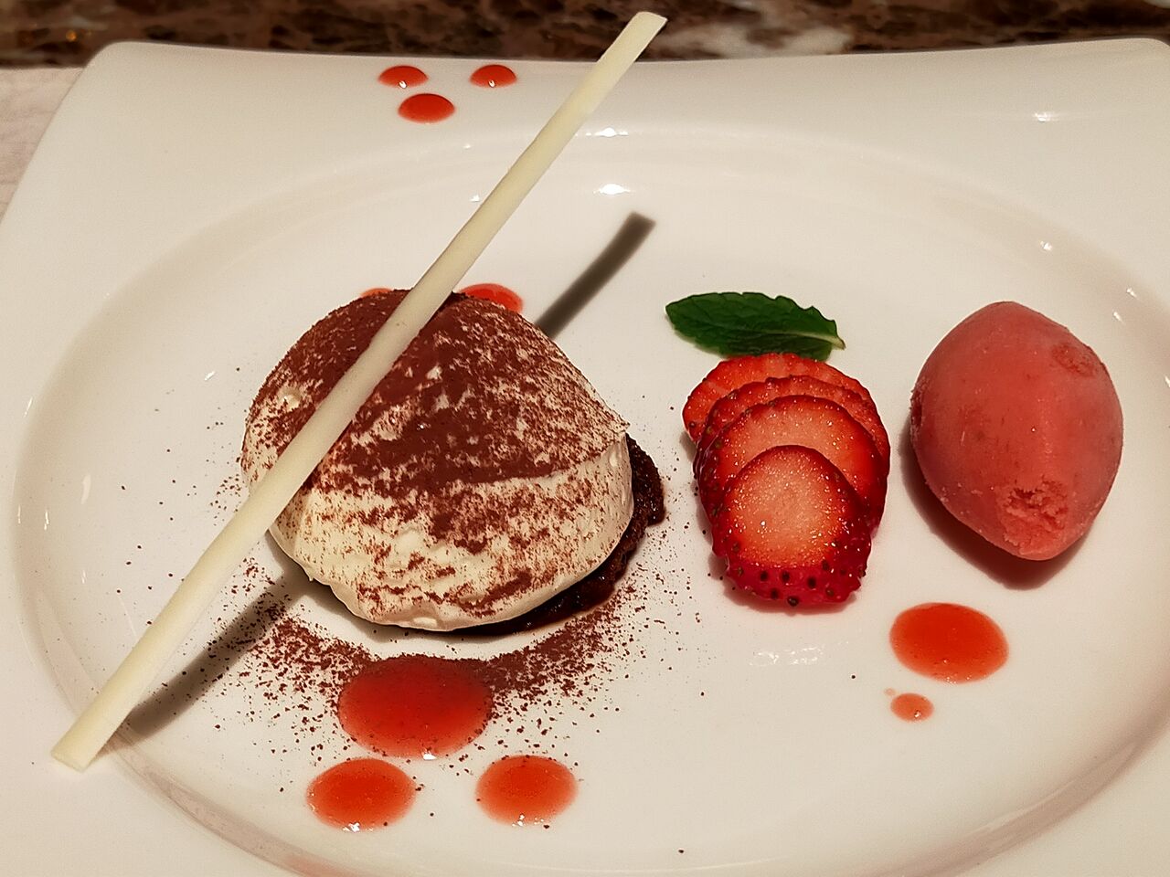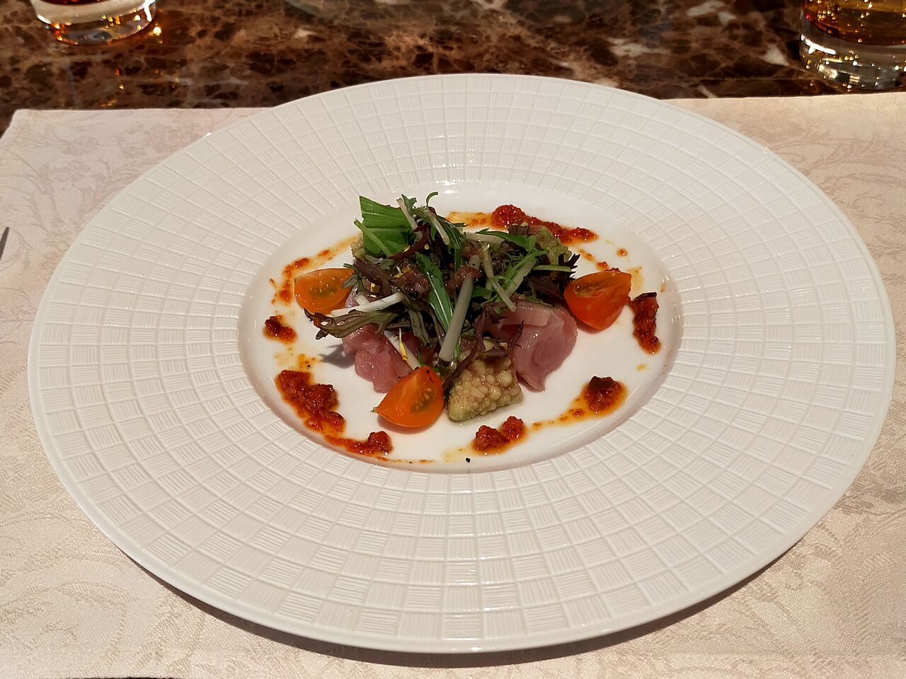 ■スモークサーモンと蕪 オリーヴパウダー チキンとアーティチョークのマリネ オニオンレーズンディップ■シーフードとトマトラグーのパスタ 彩り野菜 バジル風味のモッリーカ■本日の魚のインパデッラ 海老とイイダコ ズッパ・ディ・ペッシェまたはポークフィレ肉のアッロースト クルミのサルサ ポークのブラザート 白インゲン豆のピュレ■ティラミス みかんソルベ■コーヒー または 紅茶
