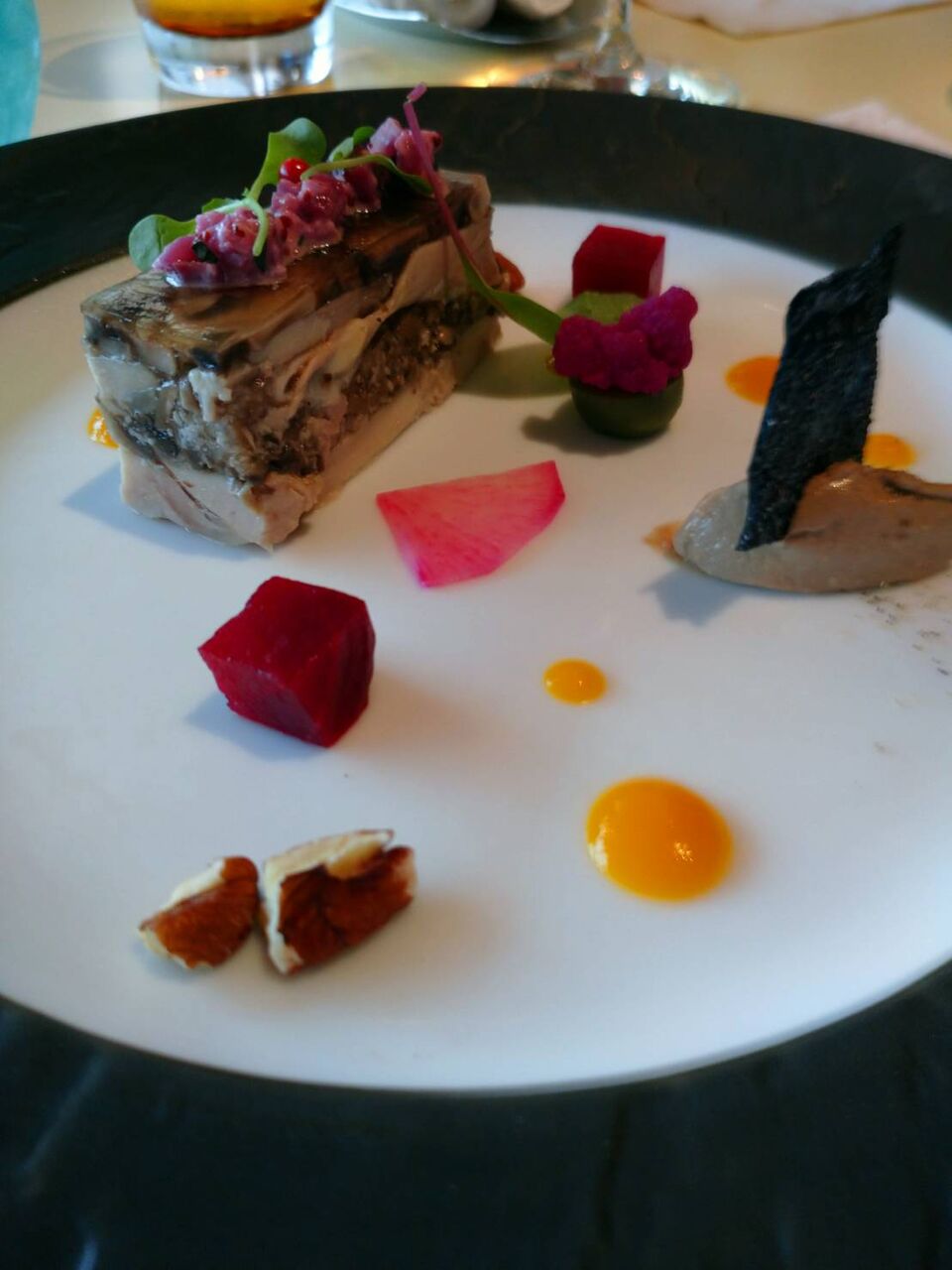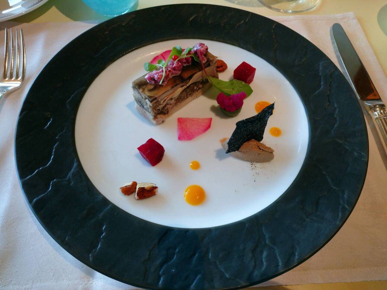 ポークのパテ 黒胡椒風味のクランブル 生ハムとアンディーヴのインサラータ