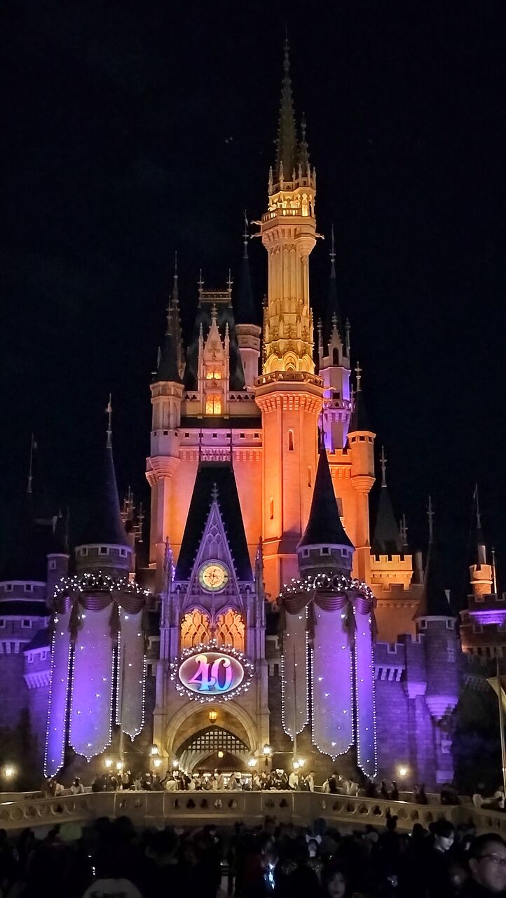 シンデレラ城前のデコレーションのライトアップバージョンがなかなか良い雰囲気。