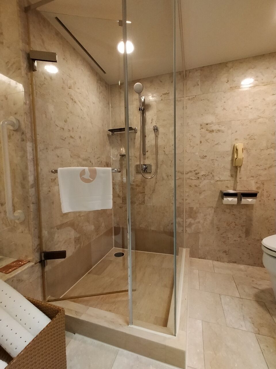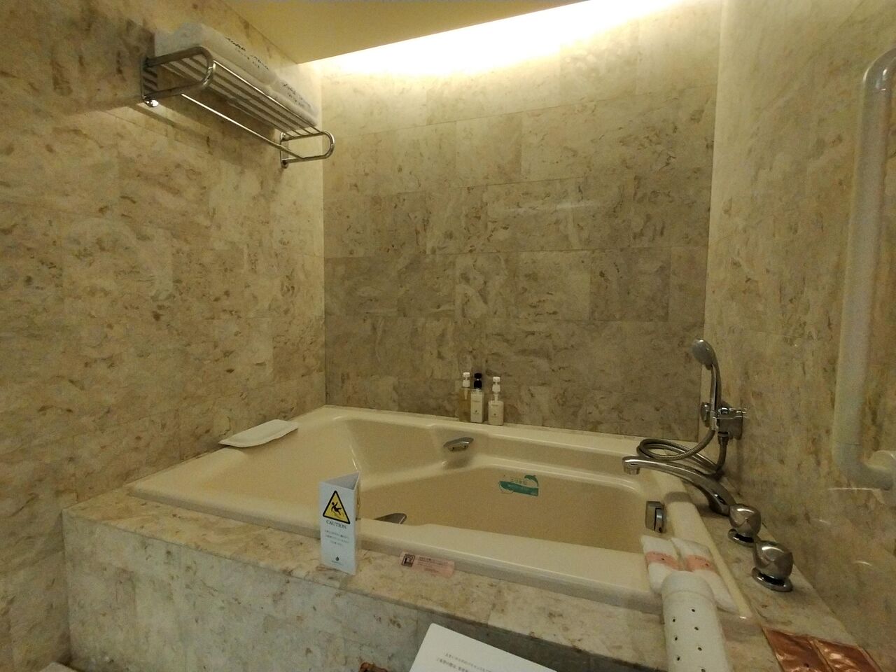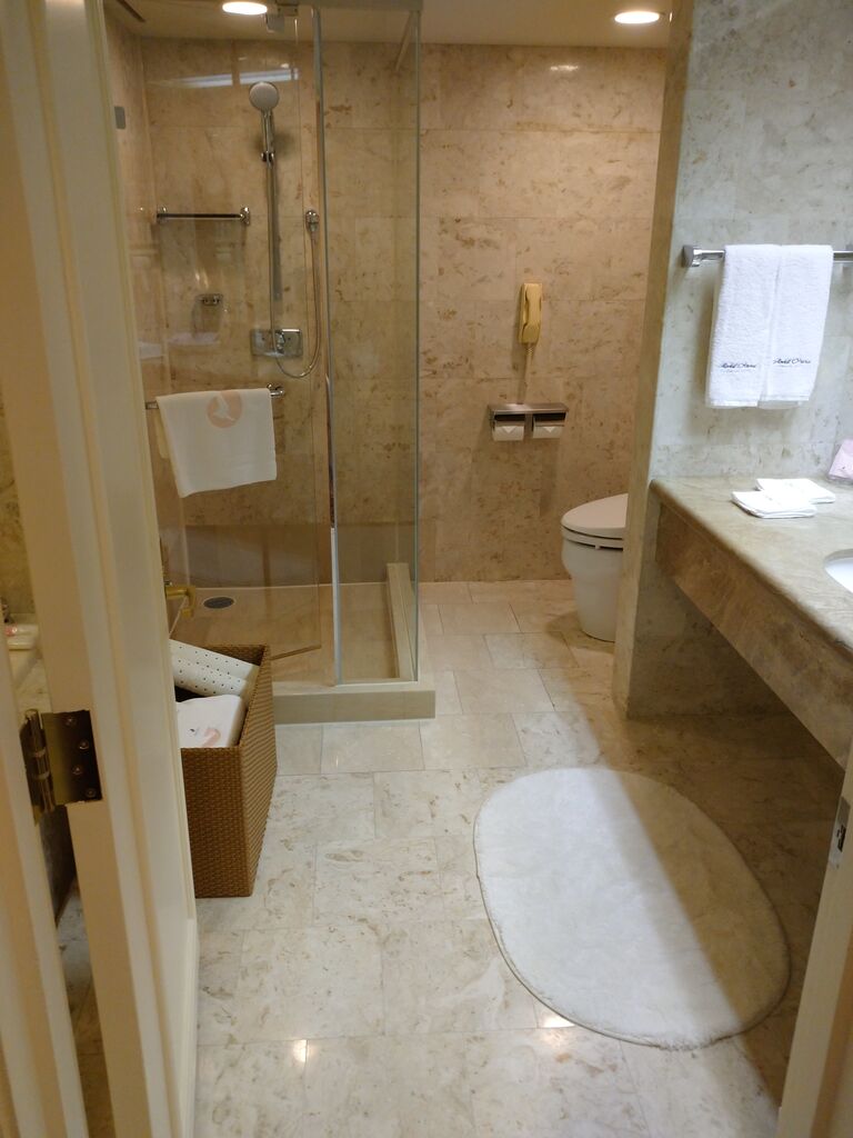 大人はそうでもないけど小さいお子さんと一緒にという場合は、ちょっと使いにくというか、ちゃんと見ていないと危ないのがオークラさんのバスルームですね。