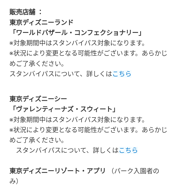 パーク内では、ランド・シー各1店舗のみでの販売でスタンバイパス対象。