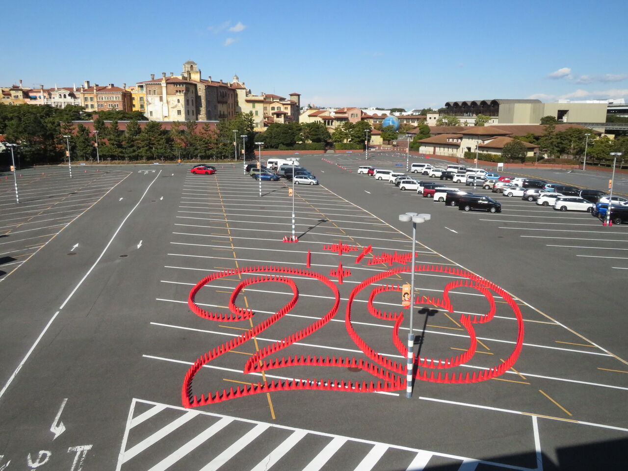 ディズニーシーの駐車場に20周年のお祝いカラーコーンアートが出来ているという話を聞いて、見てきました。