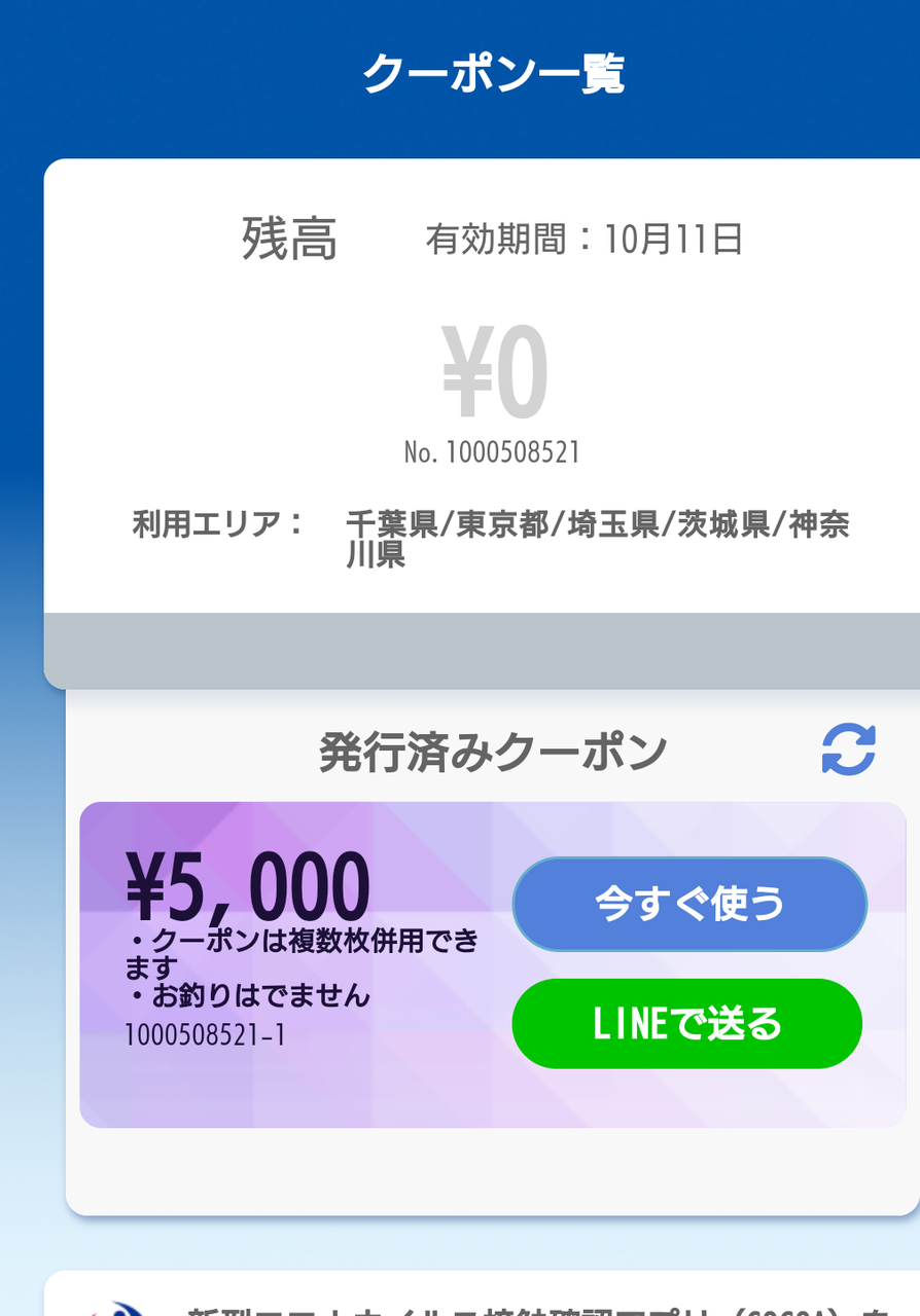 因みに、利用エリアは宿泊先とその隣県ですが、千葉県の場合東京、埼玉、茨城、神奈川で利用できます。
