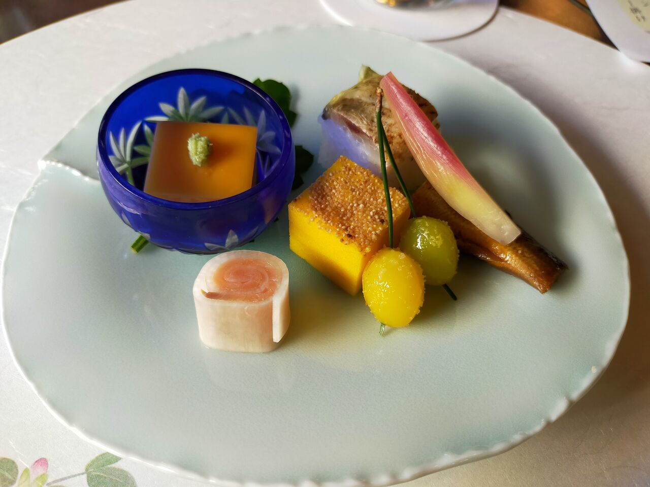 雲丹豆腐 小鯛棒寿司・茗荷 南瓜松風 鮎甘露煮 サーモン奉書巻 揚銀杏
