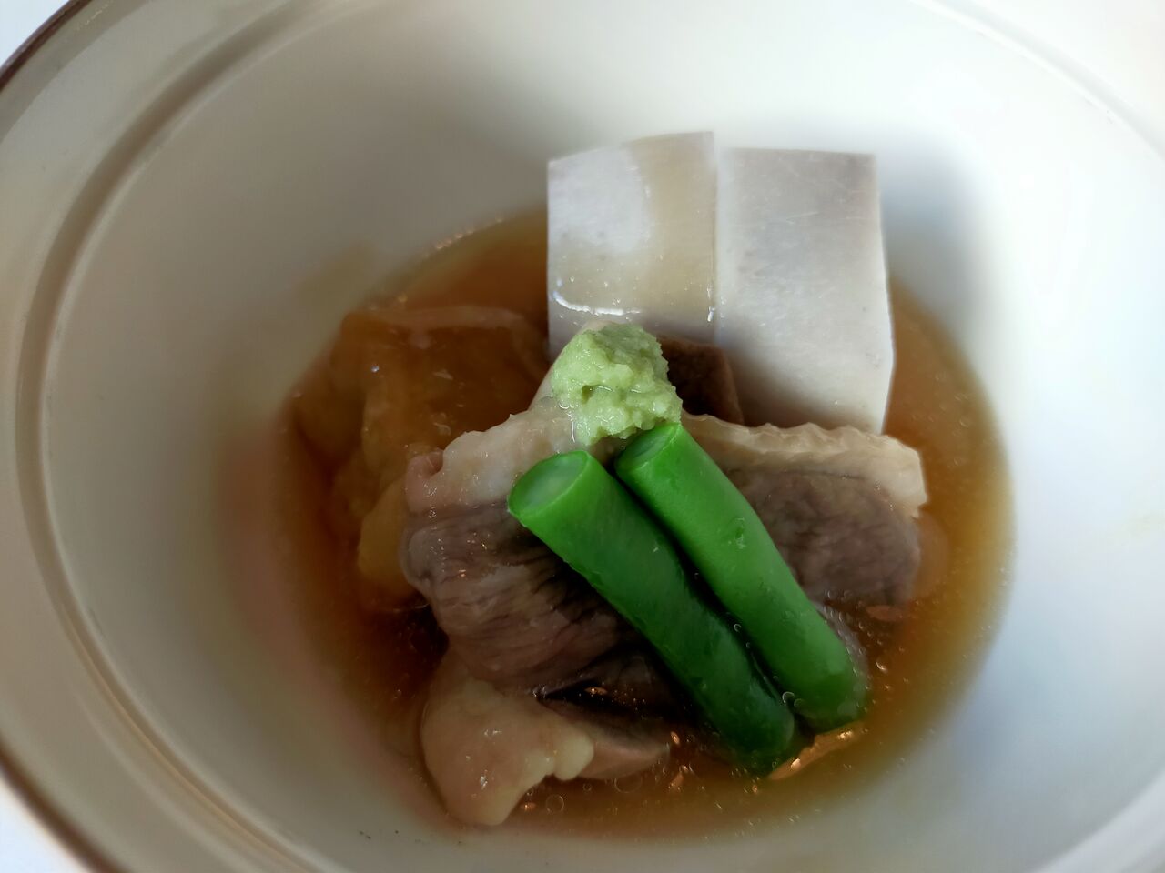 合鴨治部煮 海老芋 栗麩 青味はインゲン 山葵