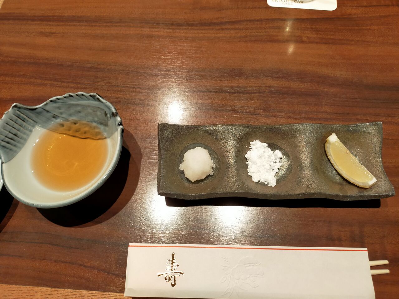 まず来たのは、天ぷら用の天つゆと、大根おろし、雪塩、レモン。