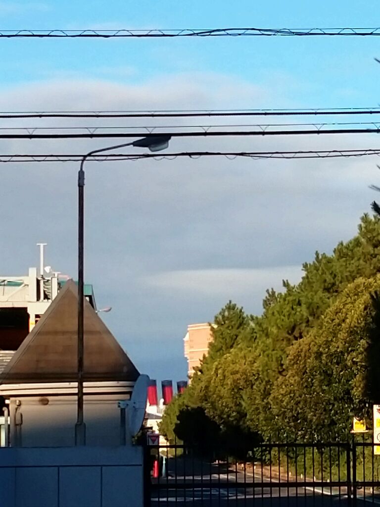 遠目に見る、朝日を浴びるディズニーシー よき。