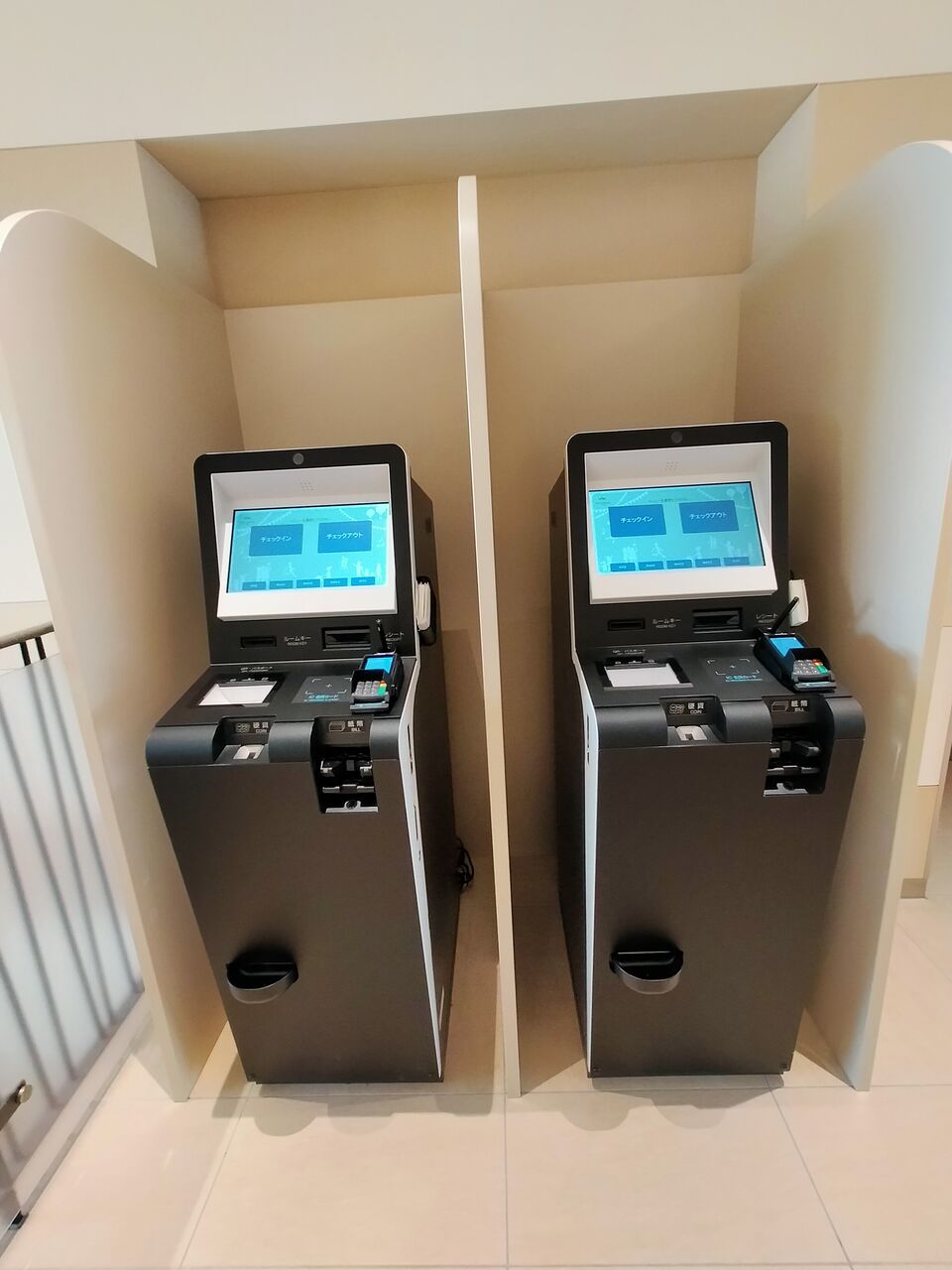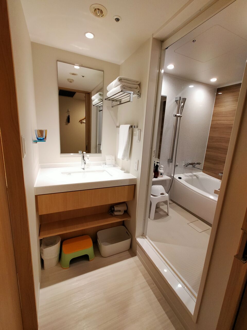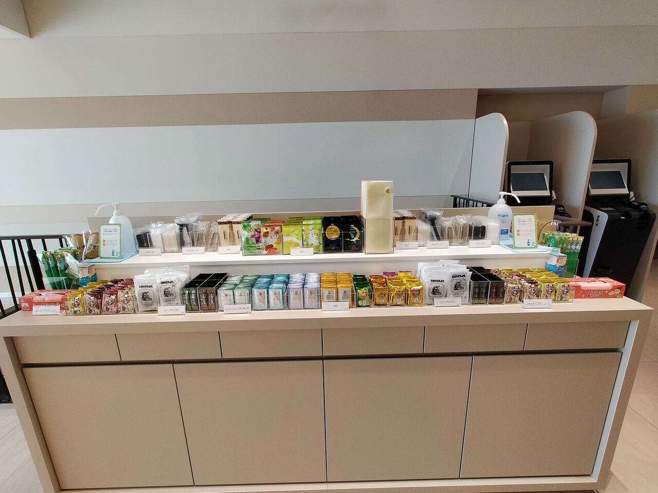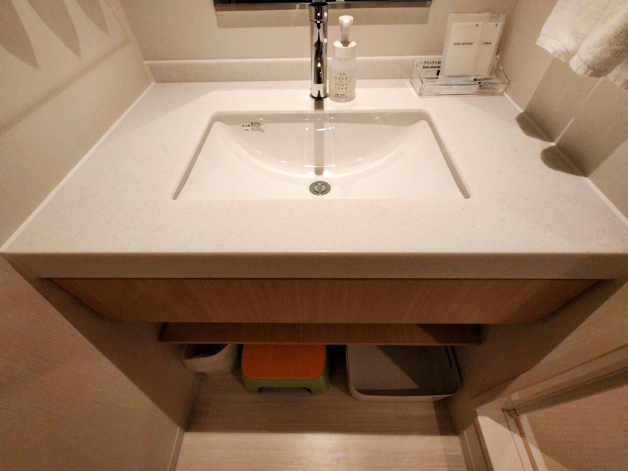 ハンドソープ・ボディスポンジ・大人用歯ブラシはこちらにあらかじめ設置されていますが、それ以外のアメニティはフロント横のアメニティステーションから持ってきます。