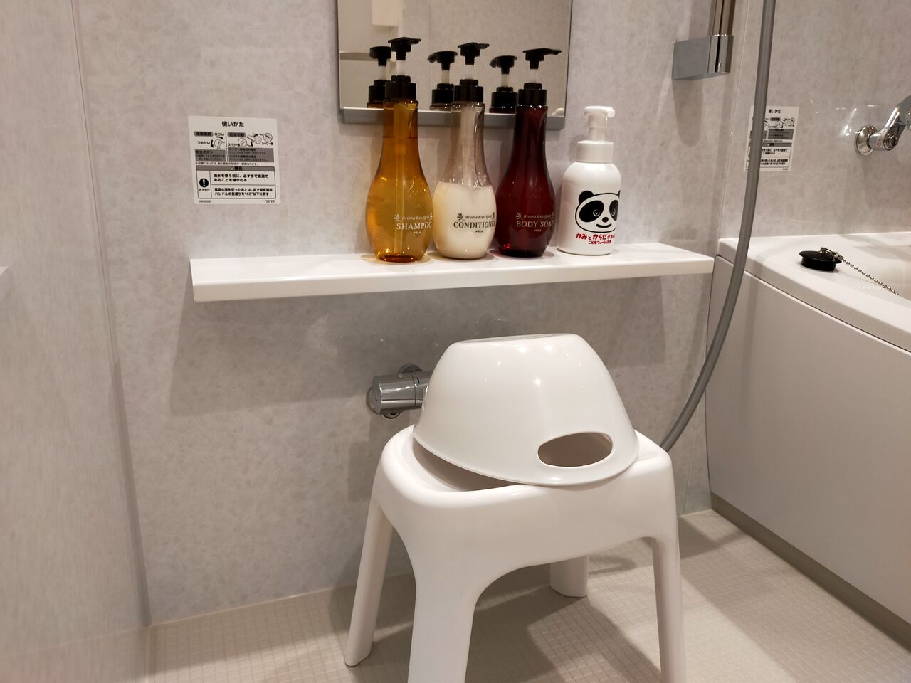 お風呂椅子・洗い桶があるのはもちろん、鏡が付いていたり、お子さん用の全身シャンプー(パンダの絵柄のもの)が設置されています。