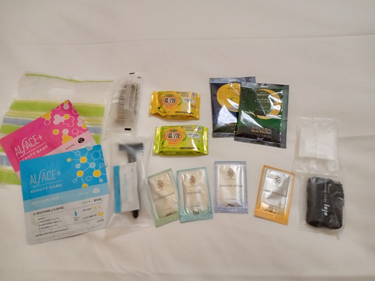 左端のフェイスパックはチェックインの際フロントで頂きました。