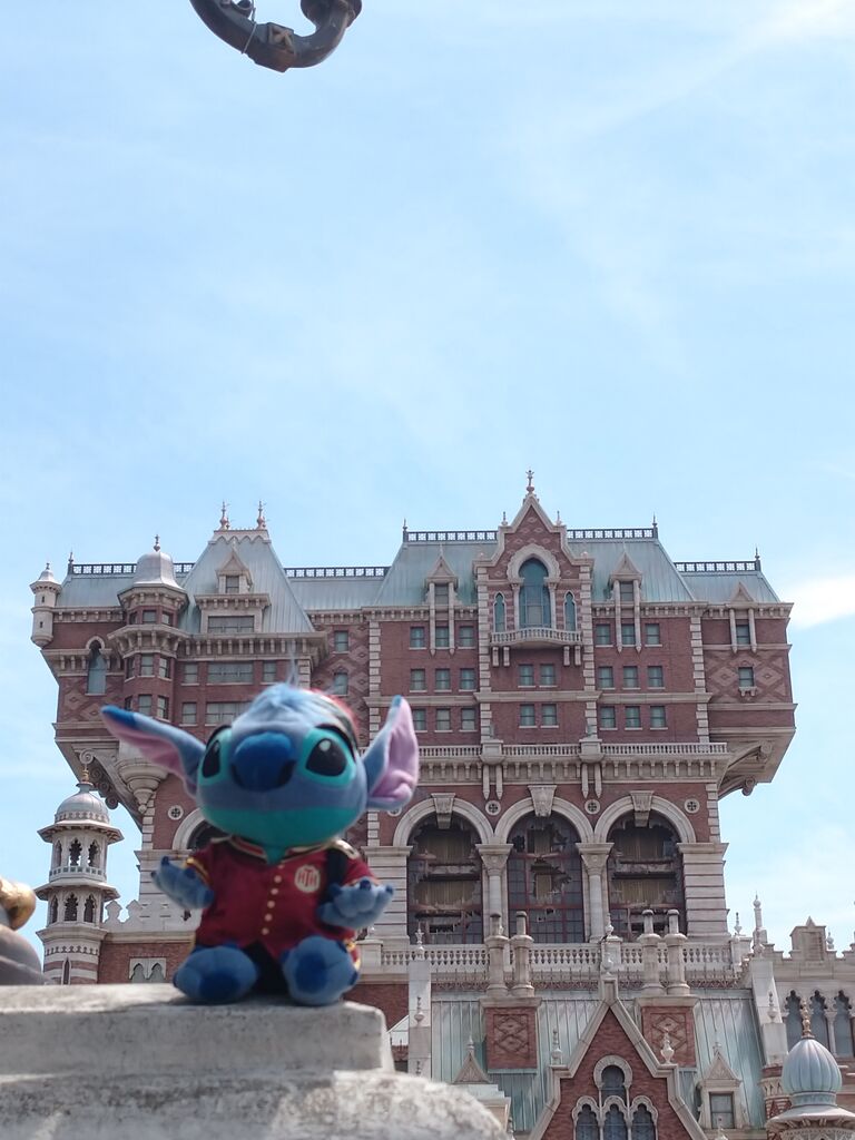 今回のお供、ハイタワーの衣装を着たスティッチとタワーオブテラーを記念撮影していたら